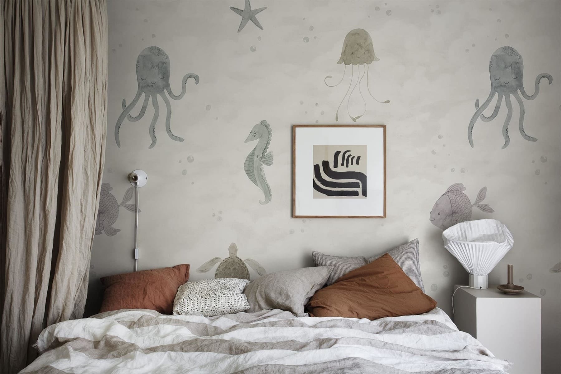 The Design: Create a serene and playful underwater world in your child’s room or nursery with the Alice Ocean mural wallpaper. Featuring charming hand-drawn marine life—gentle octopuses, whimsical seahorses, smiling fish, starfish, and more—this mural brings a soothing and imaginative oceanic scene to life.
