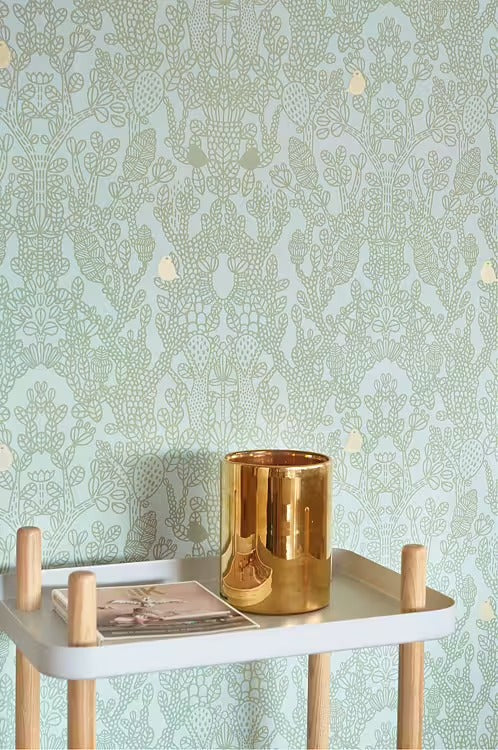 Stylized trees and foliage create a peaceful backdrop, with adorable little birds perched amongst the branches. This design has a lovely, hand-drawn feel that’s both playful and serene. It’s the perfect way to create a cozy and inviting atmosphere in any room, from a charming nursery to a lighthearted living space.