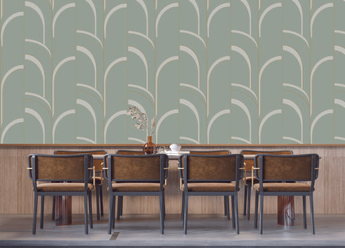 Arch Deco wallpaper is another stunning Art Deco-inspired wallpaper. Featuring geometric but irregular detailing the arches are featured on pastel backgrounds. The blend of matte and shiny inks used in this design change the nature of this clever design depending on how the light falls on the wall.