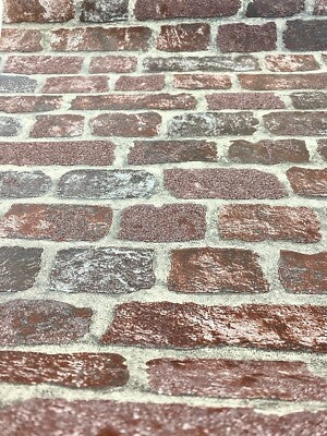 The London Street Brick wallpapers present themselves on a standard sized wallpaper roll which you will see is chunky and full of texture. The soft textured vinyl base is used to replicate the mortar in between each brick, here in rich red to deep wine tones and contains the shadowing effects to emphasise the depth of the bricks. The star of the show is undoubtedly the vintaged bricks, each of these stands proud of the surface and will be felt as you run your hands across the surface. With rough and worn edging, fantastic weathering is achieved using the mixture of dark tones and the special addition of granulated particles on the surface.