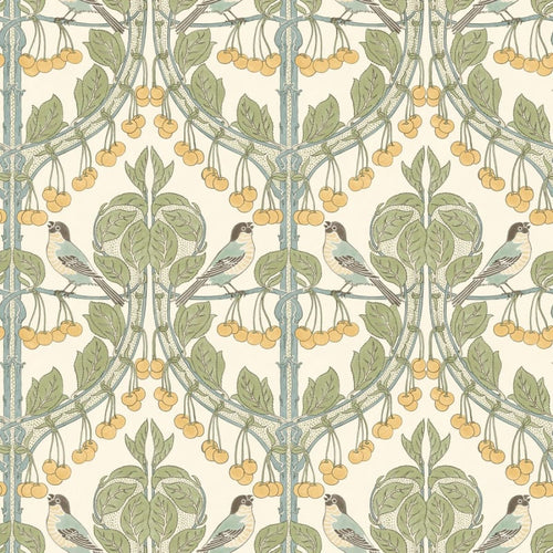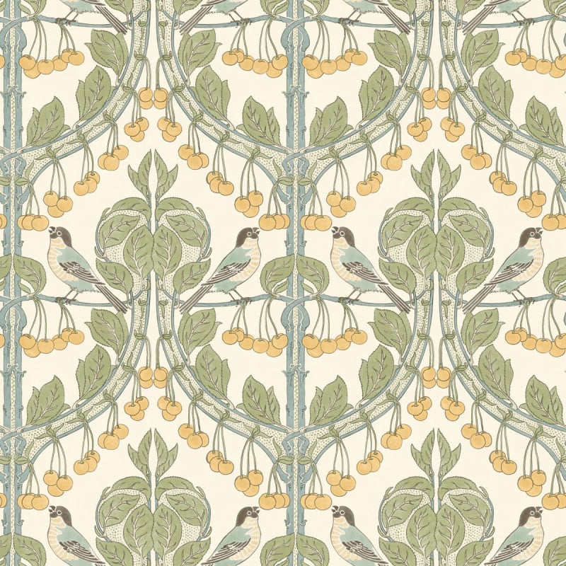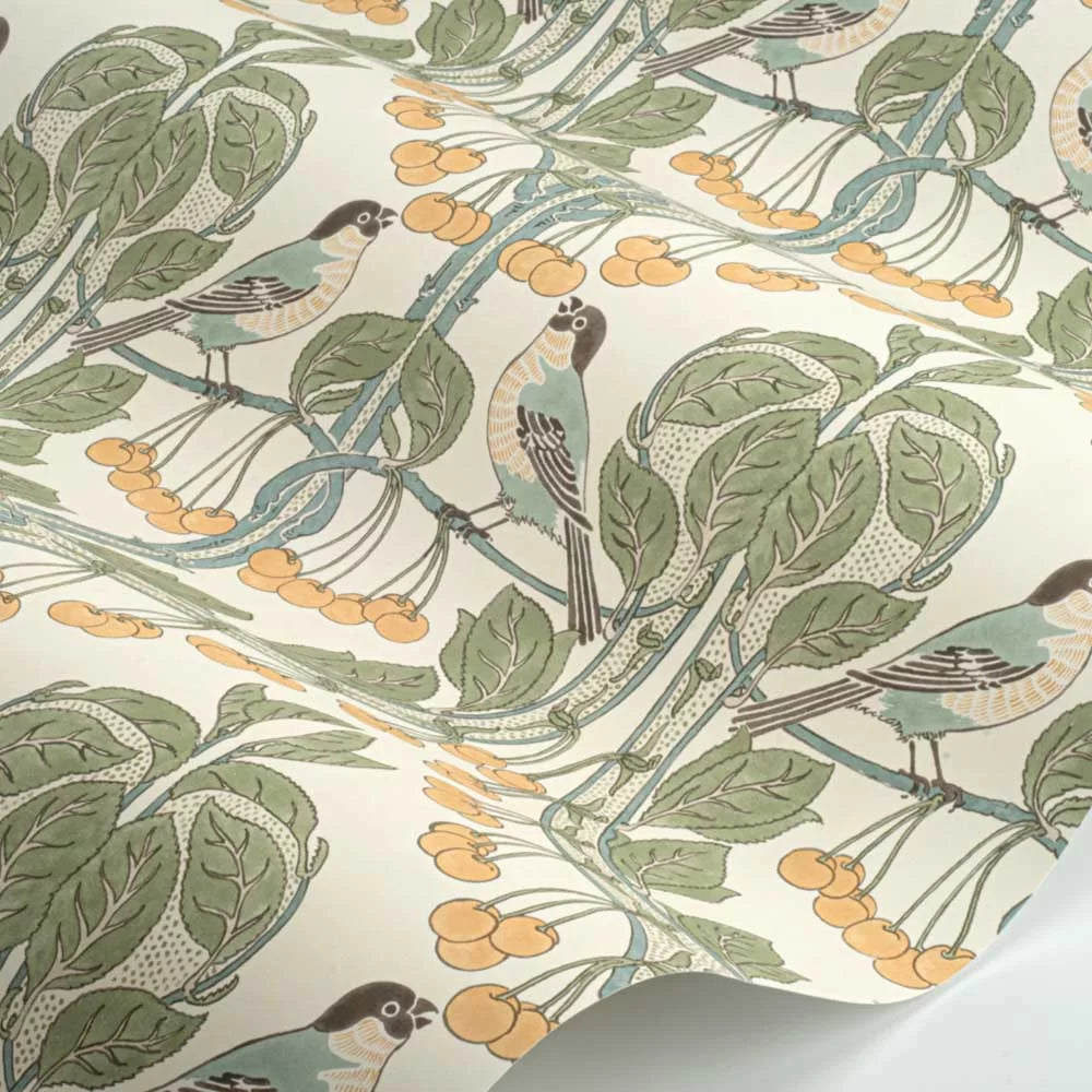 Charming birds peck at appetizing cherries in this proposal by GP & J Baker. This design, purchased by George Percival in Baker in 1897, has a fascinating symmetrical pattern. Birds and Cherries is a magnificent illustration of the Arts and Craft movement. This wallpaper is an opportunity to give a contemporary touch to any interior.