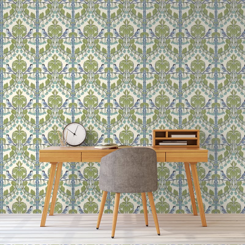 Charming birds peck at appetizing cherries in this proposal by GP & J Baker. This design, purchased by George Percival in Baker in 1897, has a fascinating symmetrical pattern. Birds and Cherries is a magnificent illustration of the Arts and Craft movement. This wallpaper is an opportunity to give a contemporary touch to any interior.