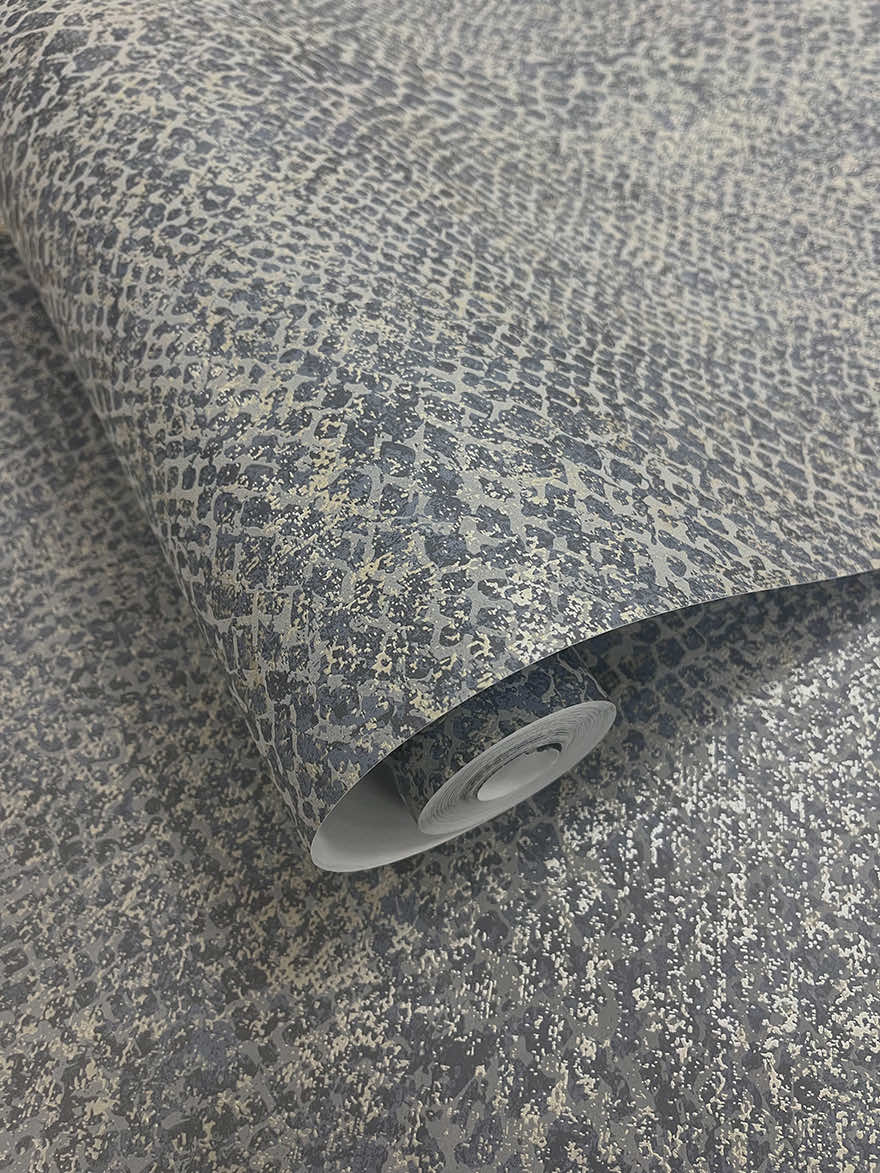 A snake-skin textured wallpaper with subtle metallic flicks and raised scales creates an exotic, luxurious look. The irregular, organic pattern adds tactile depth, while the slightly elevated scales catch light and shadow for a dynamic, three-dimensional effect.