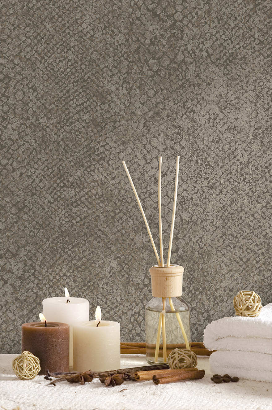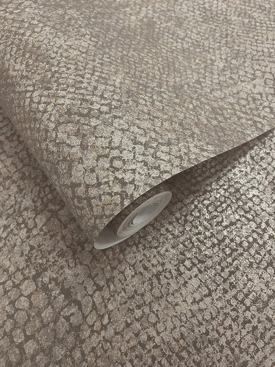 A snake-skin textured wallpaper with subtle metallic flicks and raised scales creates an exotic, luxurious look. The irregular, organic pattern adds tactile depth, while the slightly elevated scales catch light and shadow for a dynamic, three-dimensional effect.