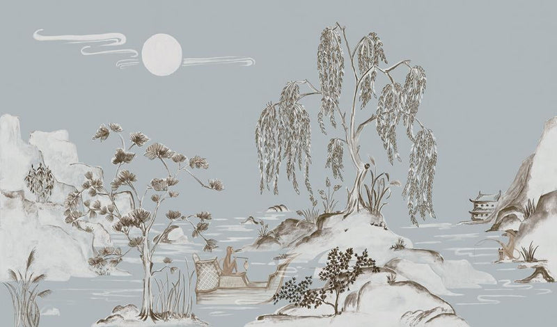 The natural variance in the texture and the dying process creates a unique piece with every drop. Once the wallpaper is made the design is printed. Moonlight features an oriental type scene of swaying trees, pavilions, junk boats and even a monkey contemplating the reflection of the moon.
