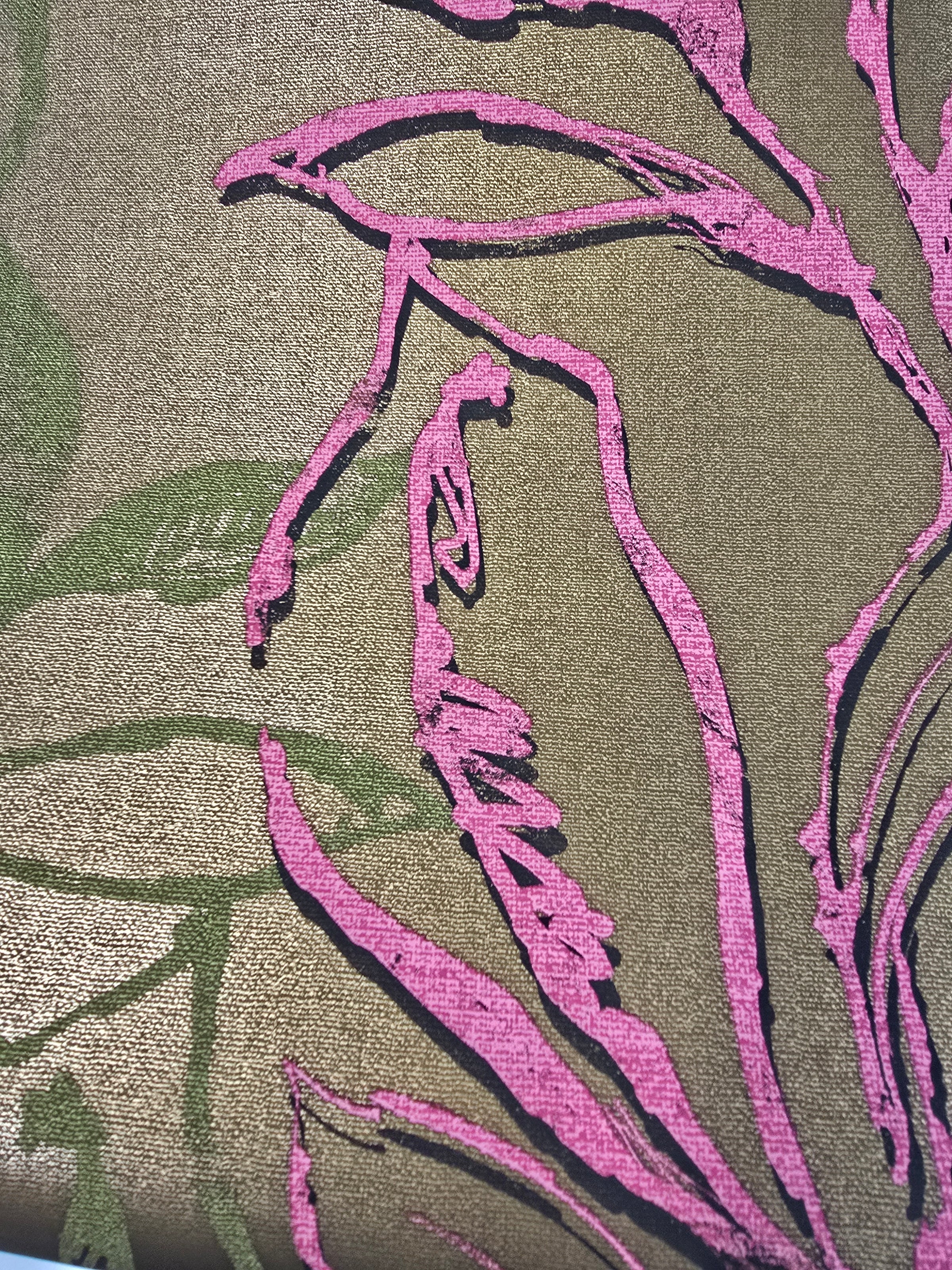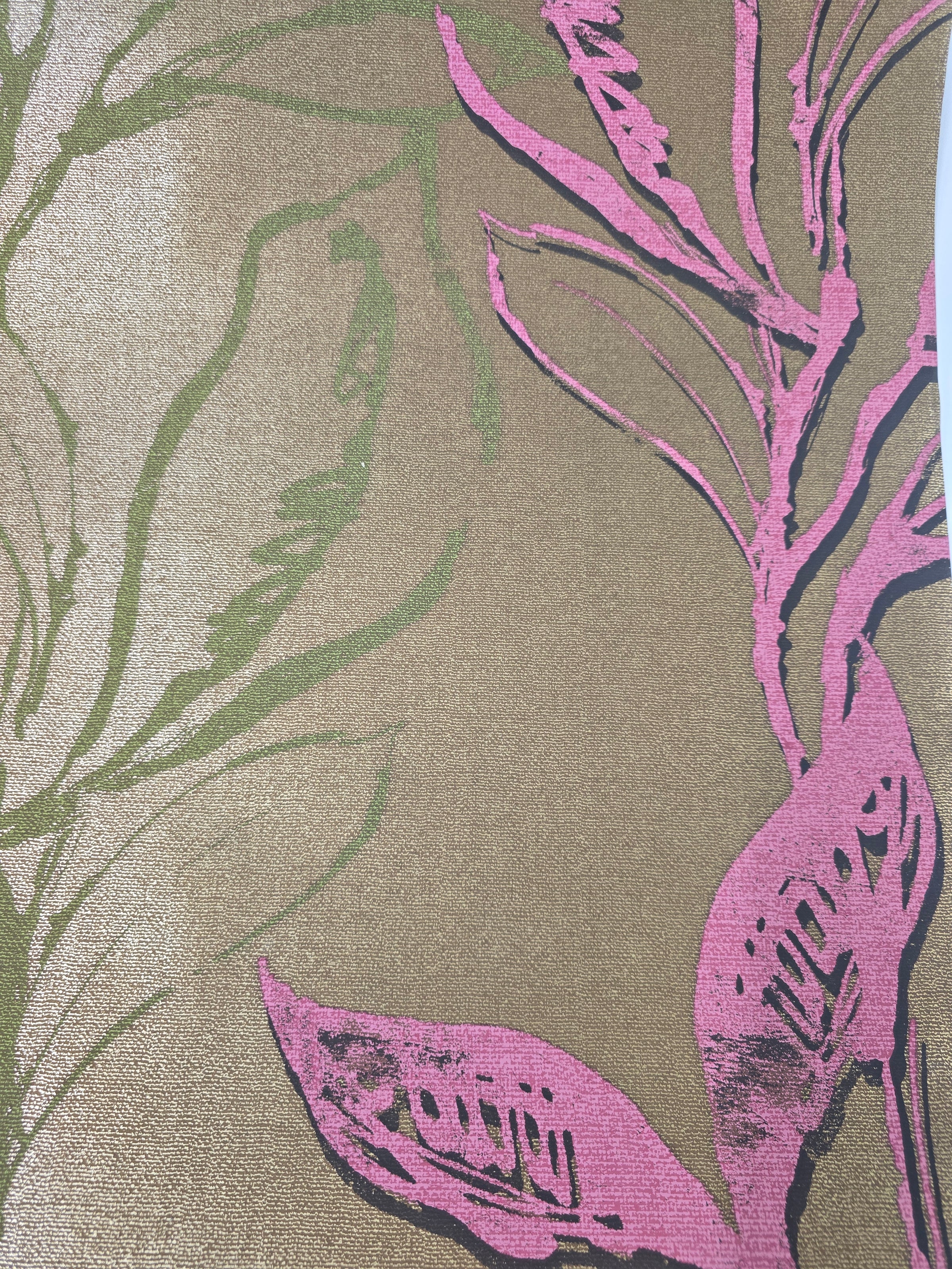 From the US (Printed in Canada) - wallpaper legends Seabrook have reproduced this stunning Albert Van Luit wallpaper. Midcentury in design with a bronze - gold background with abstract Neon pink and soft green leaf.