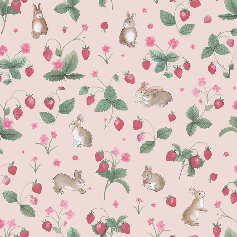This charming wallpaper features adorable bunnies playing among the lush strawberry patches bringing a touch of nature’s magic to any child’s room.