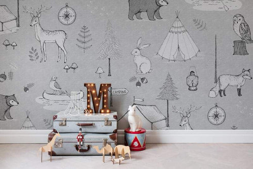 Camping Trip - Grey - Custom Sized Mural Wallpaper (per m2)