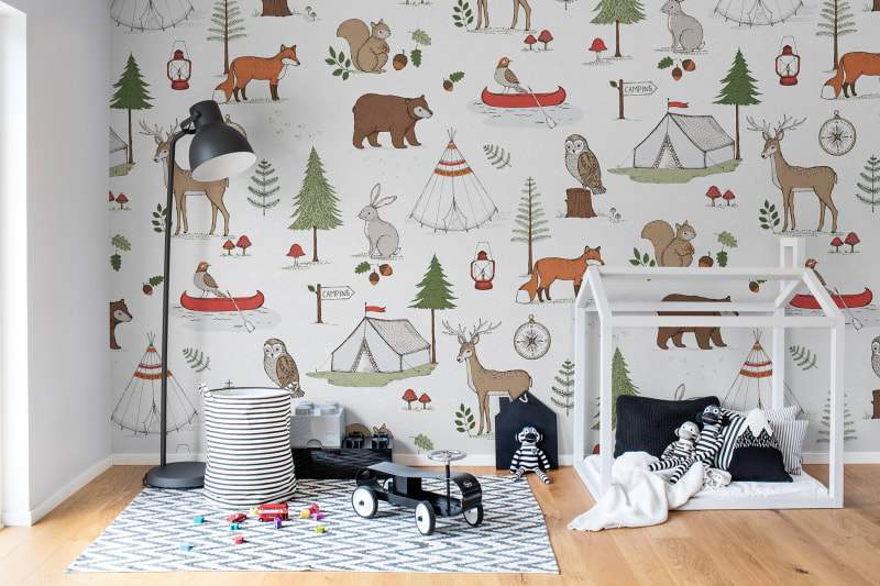 The Design: Camping Trip - the mural/wallpaper is fun! Just add an actual bag of marshmallows and a camp fire outside for the ultimate cosy experience. This whimsical wall mural is perfect for long nights full of storytelling and will surely boost the creativity in any kids room. Designed by wallpaper gurus Rebel Walls.