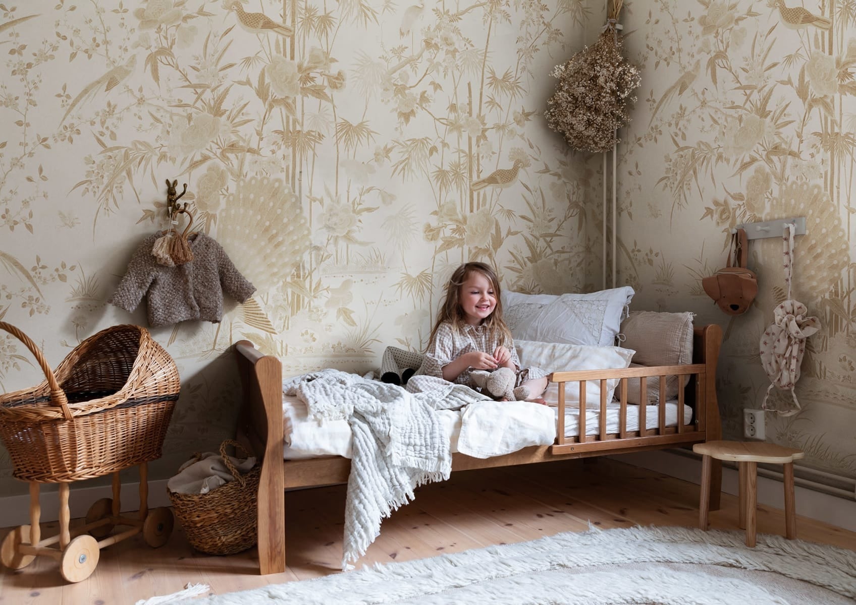 Soft hues of blush pink, muted greens, and earthy browns create a harmonious palette that evokes tranquillity and sophistication. Ideal for living rooms, bedrooms, or any space that seeks a touch of refined beauty, this mural transforms walls into a serene sanctuary where nature and artistry intertwine.