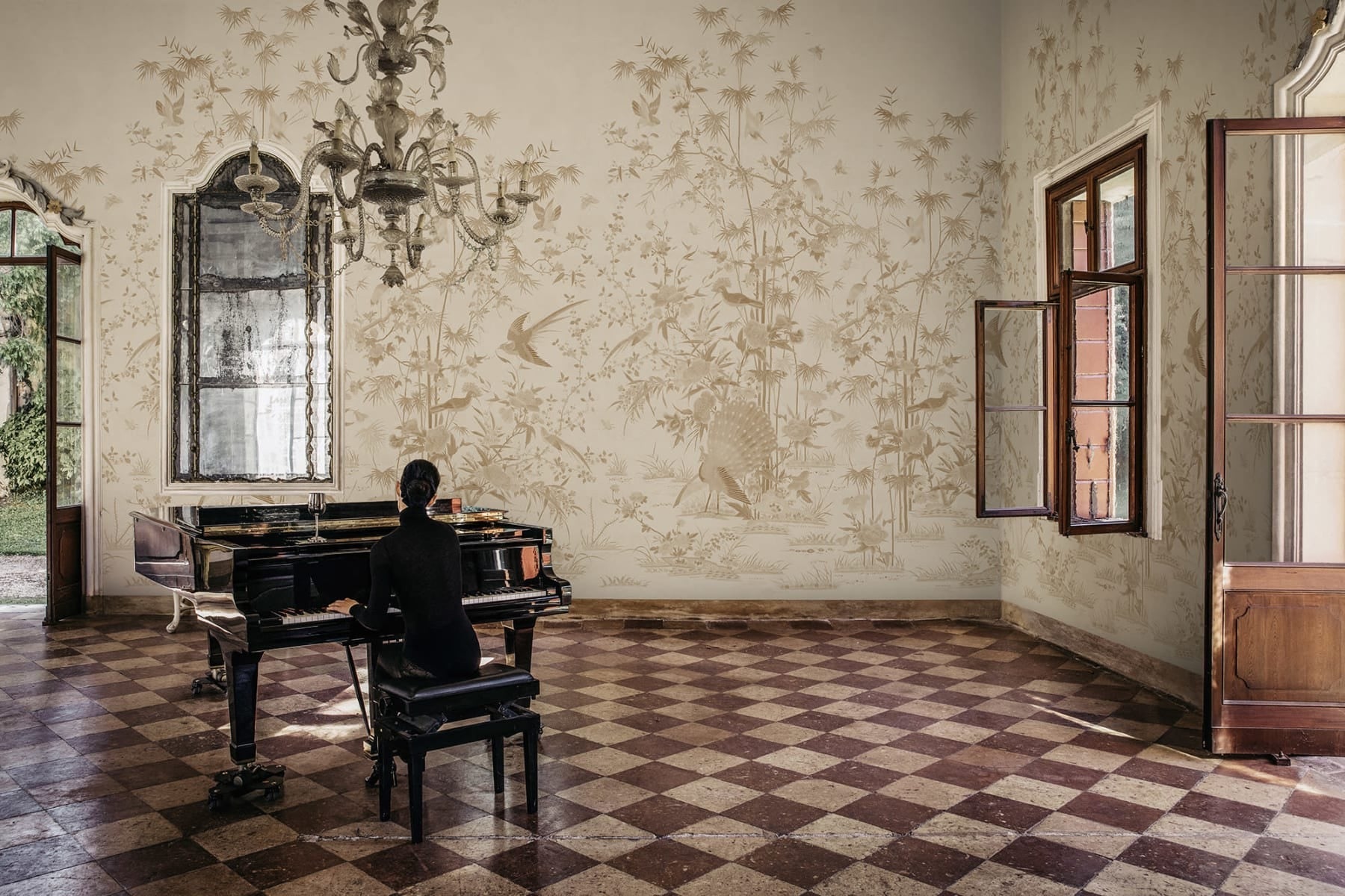 The Design: Invite the timeless elegance of a classic Asian garden into your home with the Garden of Serenity mural wallpaper. This exquisite design features a delicate blend of blooming florals, graceful bamboo stalks, and an array of exotic birds, including peacocks displaying their resplendent plumage.