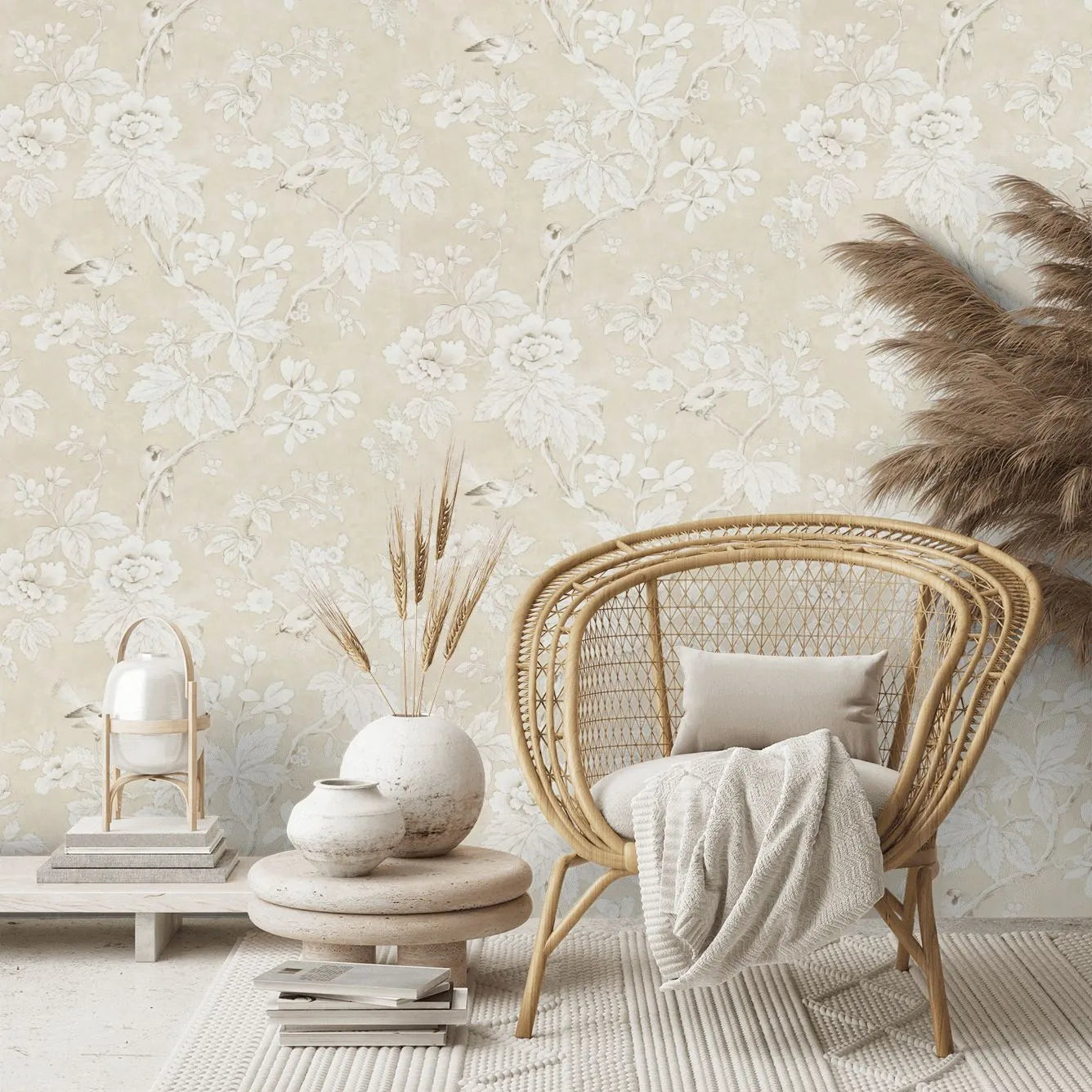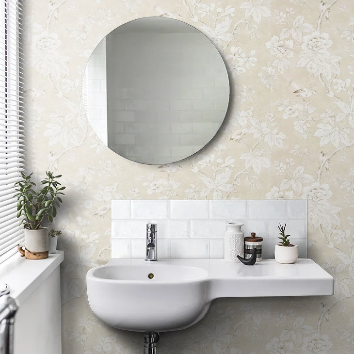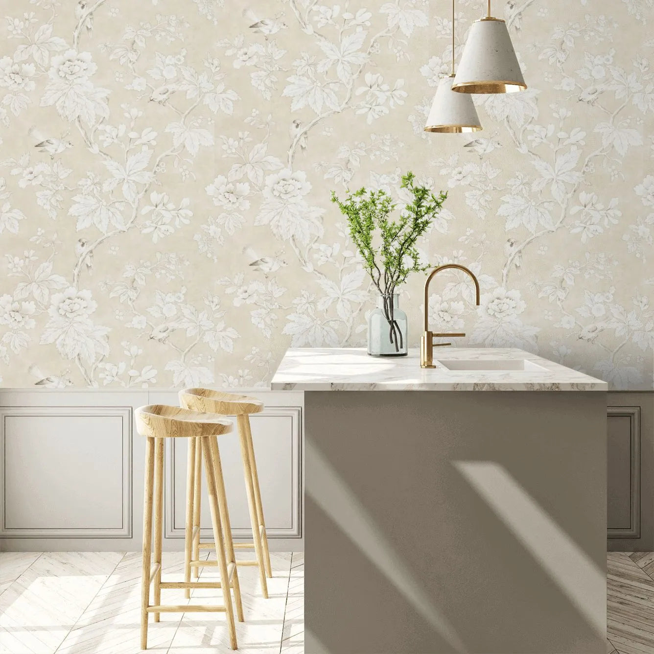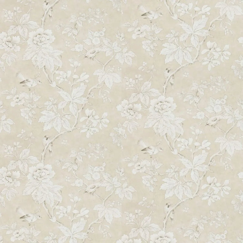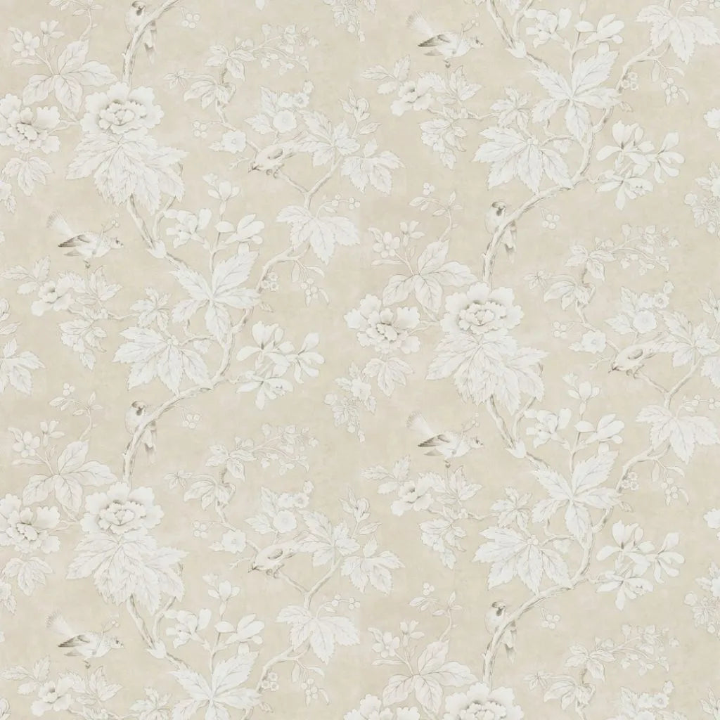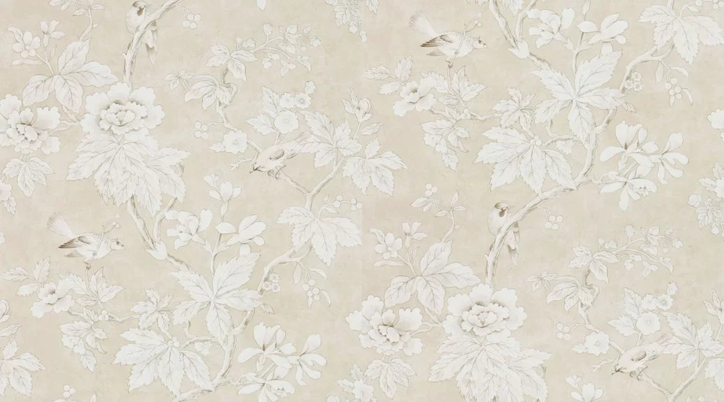 Chiswick Grove Wallpaper is a classic chinoiserie style floral tree trail in a neutral colour set against a plaster effect background with pretty watercolour effect birds.