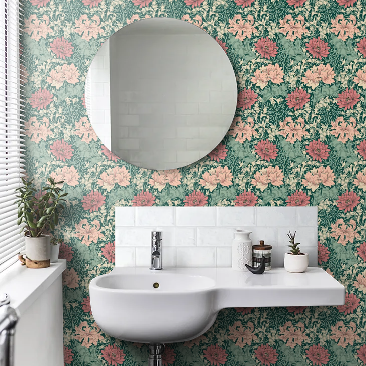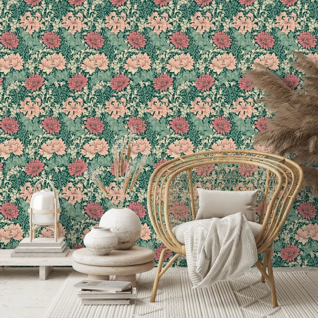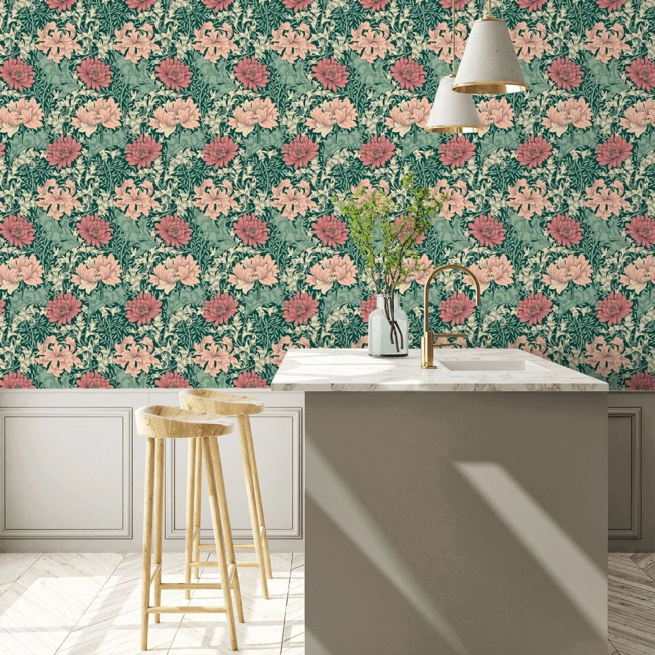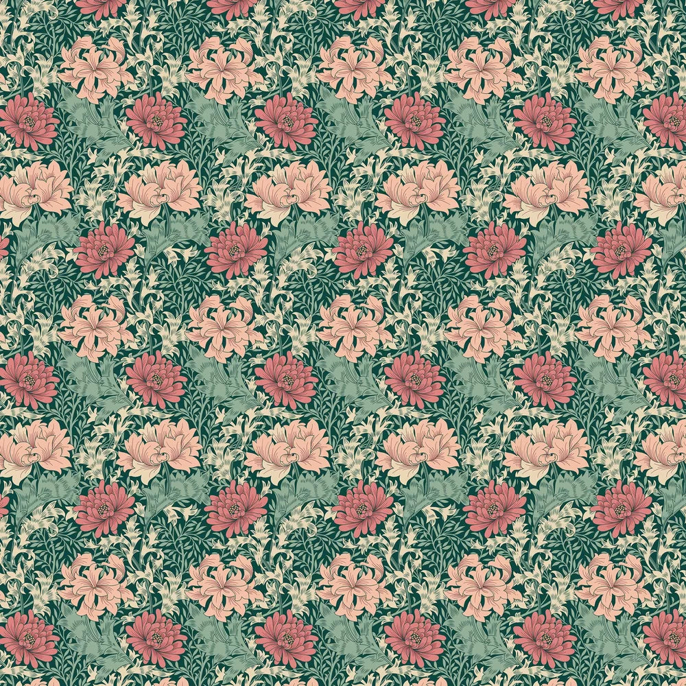 Chrysanthemum - Eden by Morris Wallpaper - Green/Pink