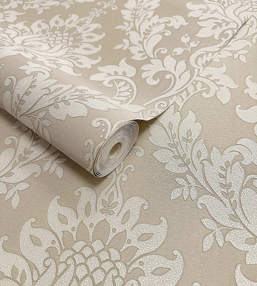 This sophisticated design showcases an ornate damask motif, subtly raised against a soft beige backdrop with a gentle shimmer. The combination of delicate detailing and a silky sheen creates a refined texture that catches the light, adding depth and grace to any room.