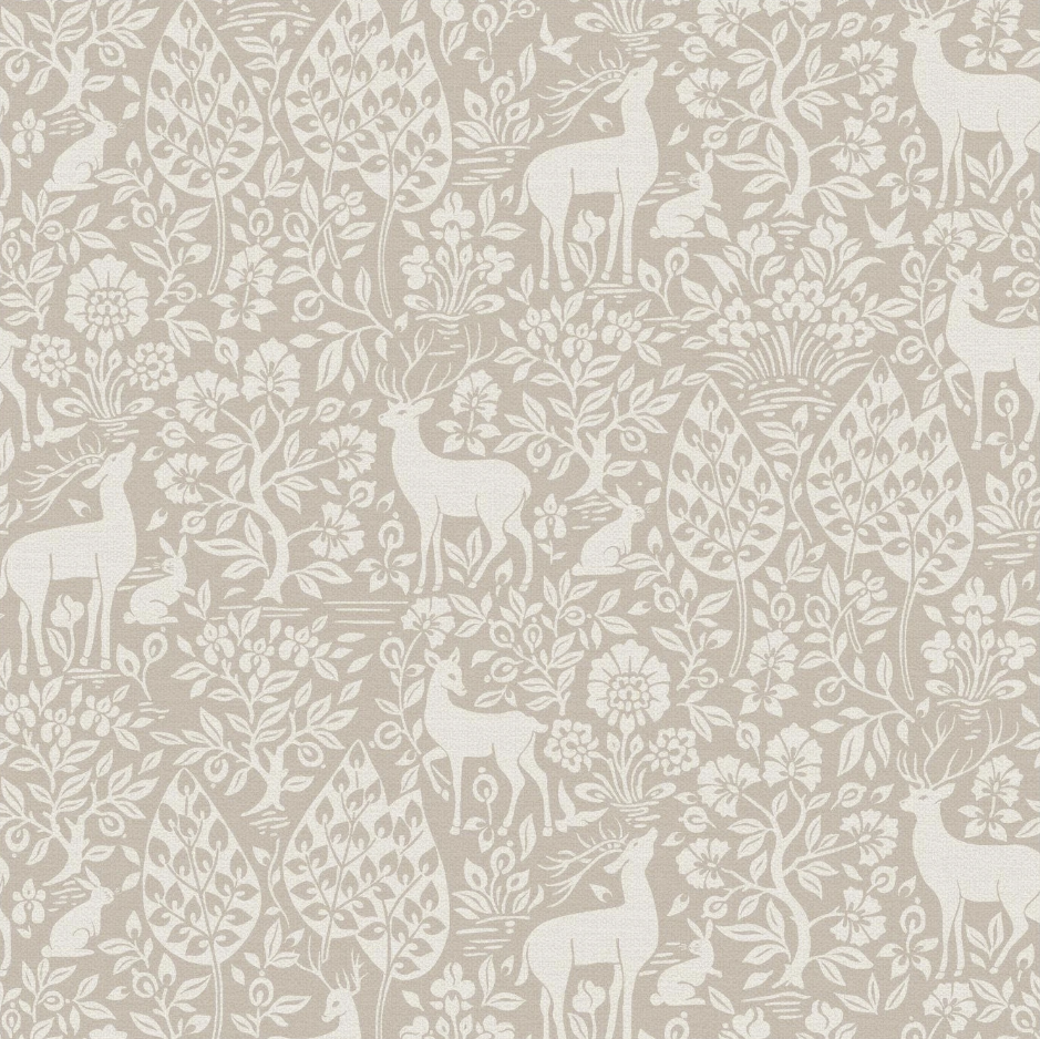 A peaceful forest scene with deer and rabbits, the natural beauty enhanced by a soft linen texture that ties the wildlife and landscape together.