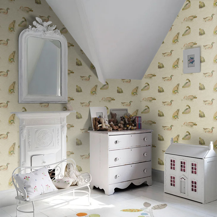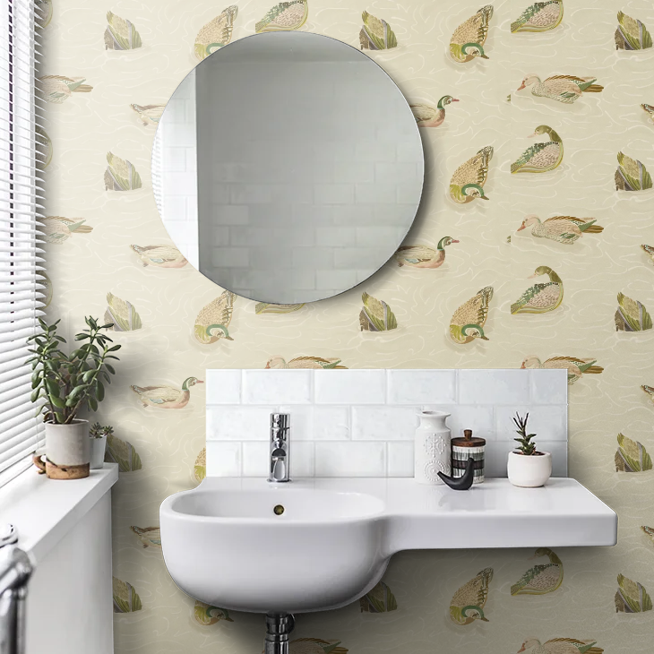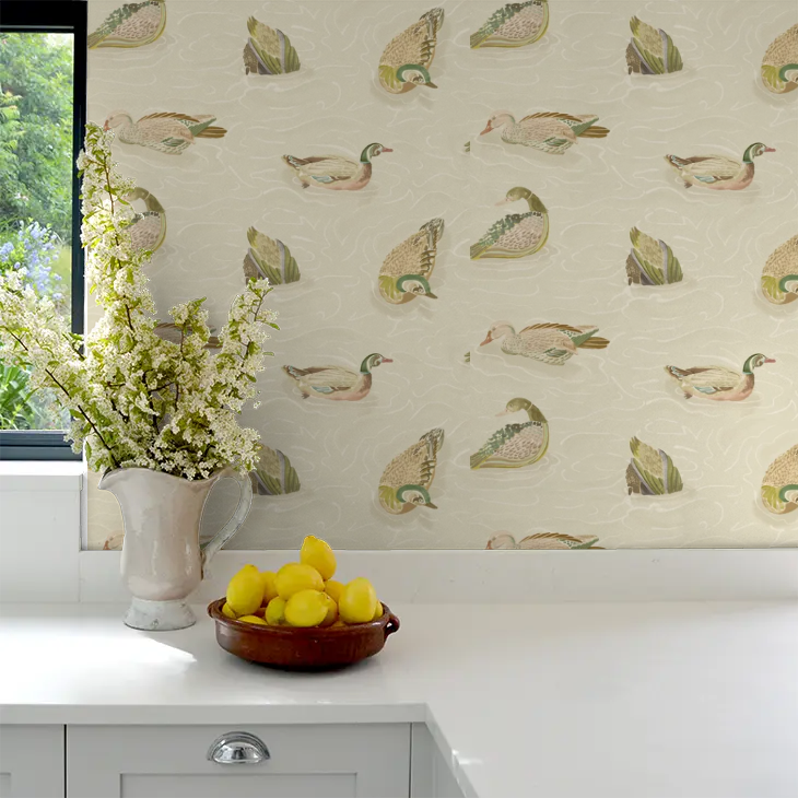 Create a charming scene with the Duck Pond Wallpaper by Mulberry Home. This detailed design features a gentle repeat of ducks and ponds, bringing a sense of peaceful, countryside whimsy to your walls. Perfect for adding a touch of narrative and classic character to a room.