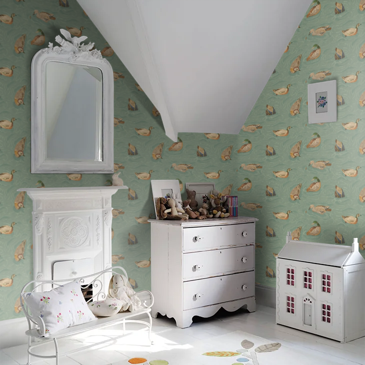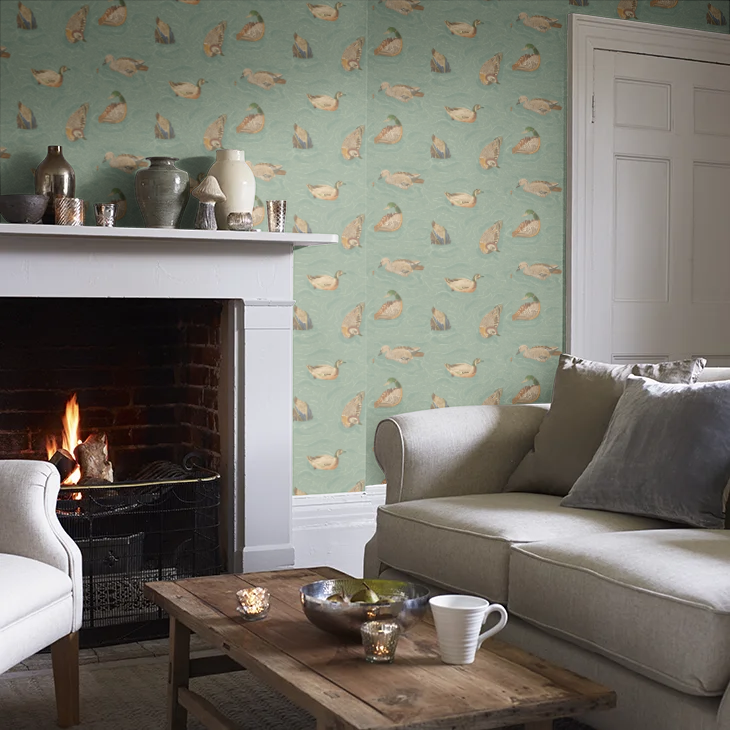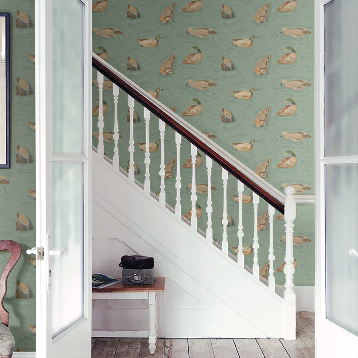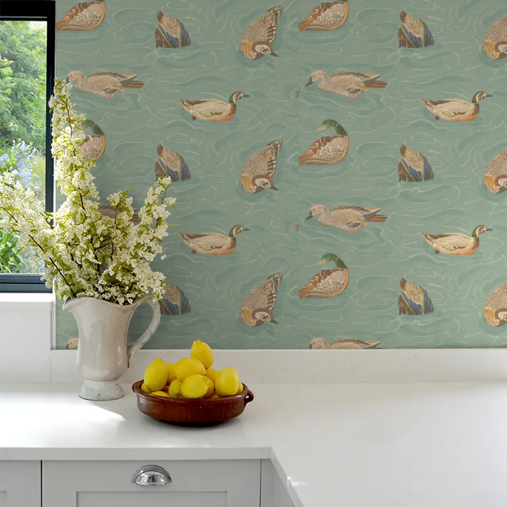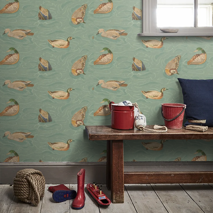 Create a charming scene with the Duck Pond Wallpaper by Mulberry Home. This detailed design features a gentle repeat of ducks and ponds, bringing a sense of peaceful, countryside whimsy to your walls. Perfect for adding a touch of narrative and classic character to a room.