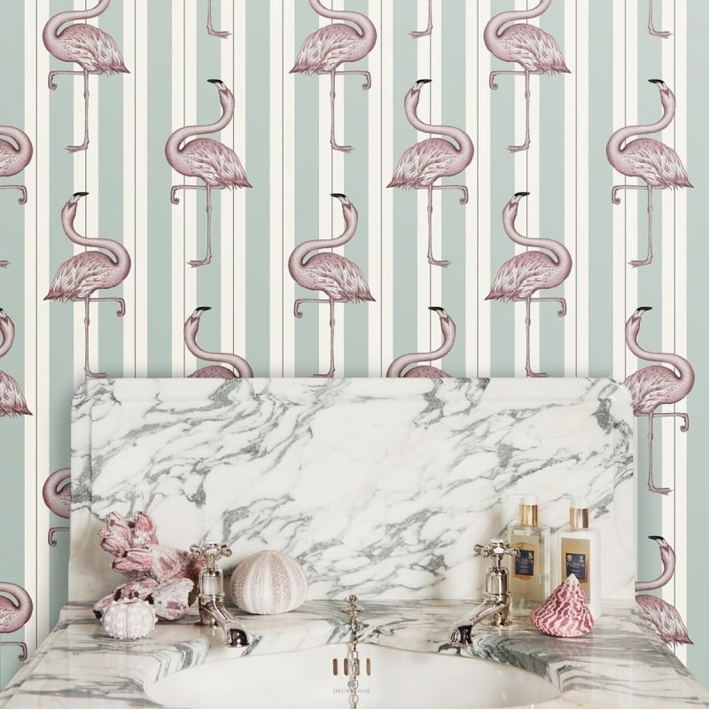 This wallpaper is a celebration of wit and wonder, where the elegance of Art Deco design meets the vibrancy of the animal world. The pink flamingo motifs, with their inherent grace and charm, create a visually captivating dance against the sophisticated canvas of off-white and lavender stripes. Each element is thoughtfully curated to evoke a sense of timeless glamour with a playful twist.