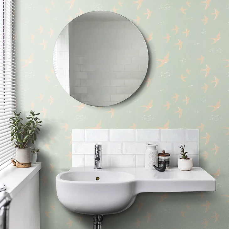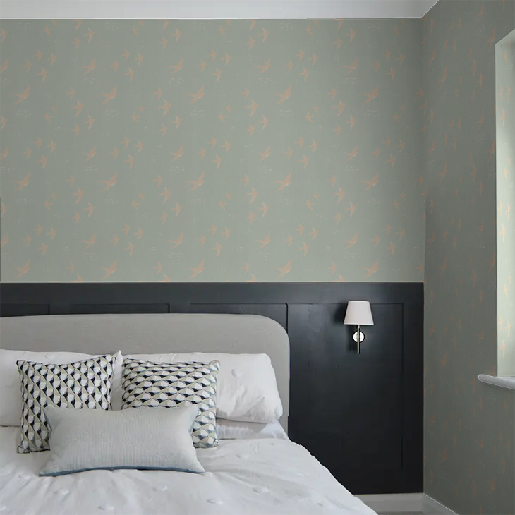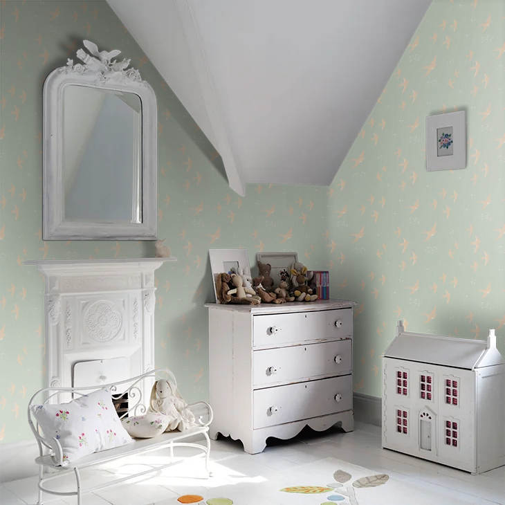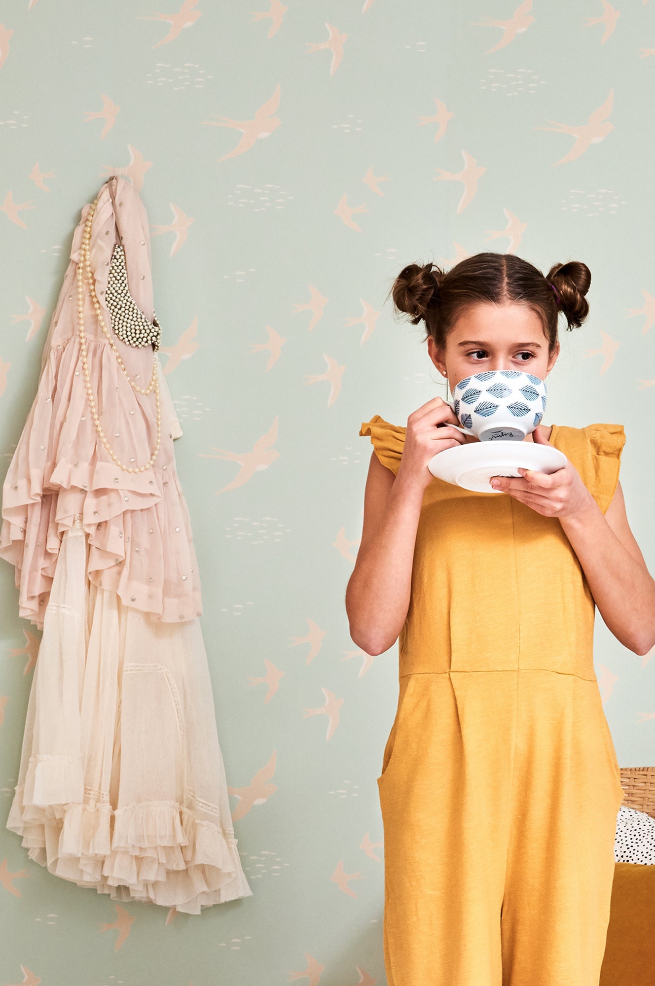 Typically Scandinavian in design, and with a hand painted feel, Follow the wind wallpaper is made in Sweden and printed on non-woven material with colours that are water-based and completely free from solvents and PVC. Design by Charlotta Sandberg for Majvillan. Excess colour is managed in an environmentally sound manner and paper waste is converted into heat. The wallpaper has a very beautiful surface where you can feel the colour structure with your bare hand.