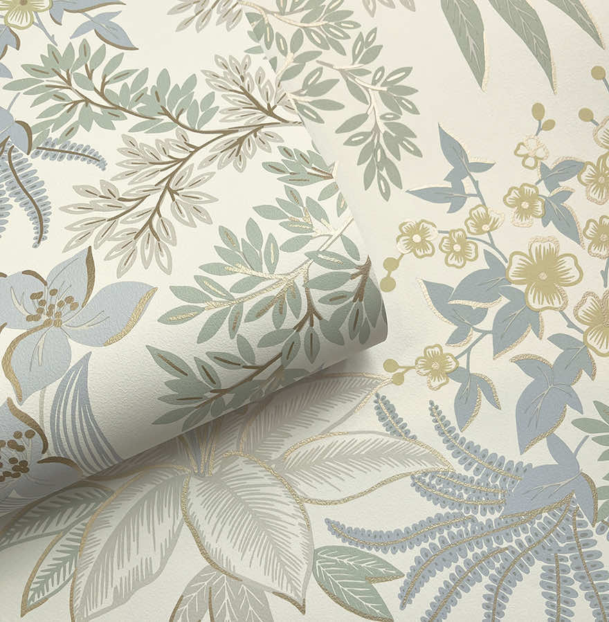 A vibrant nature filled scene featuring trees, flowers and lush foliage beautifully intertwined in full bloom. Delicate metallic highlights subtly enhance the details, adding a touch of elegance and depth. The combination of rich botanical elements with a hint of shimmer brings life and sophistication to any space.