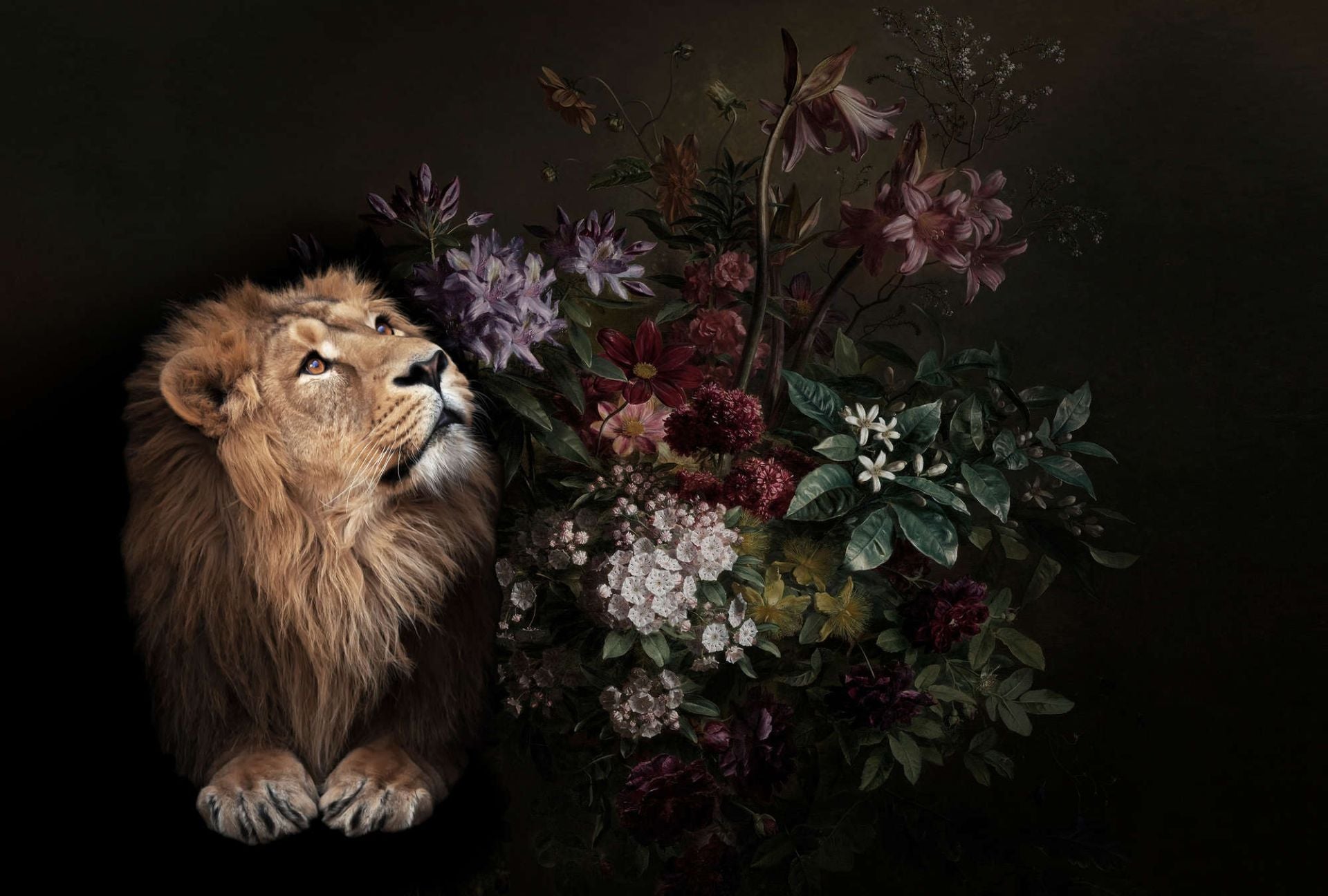 The Design: Step into a whimsical world where the wild meets the wonderful. This striking wallpaper design features a majestic lion nestled among a lush garden of blooming flowers and intricate foliage. Illustrated with fine lines and artistic detail, the scene balances power and serenity—making it an ideal statement piece for those who appreciate nature with a touch of fantasy. The lion, regal yet calm, brings a quiet strength to the space, while the surrounding flora softens the mood with organic elegance.