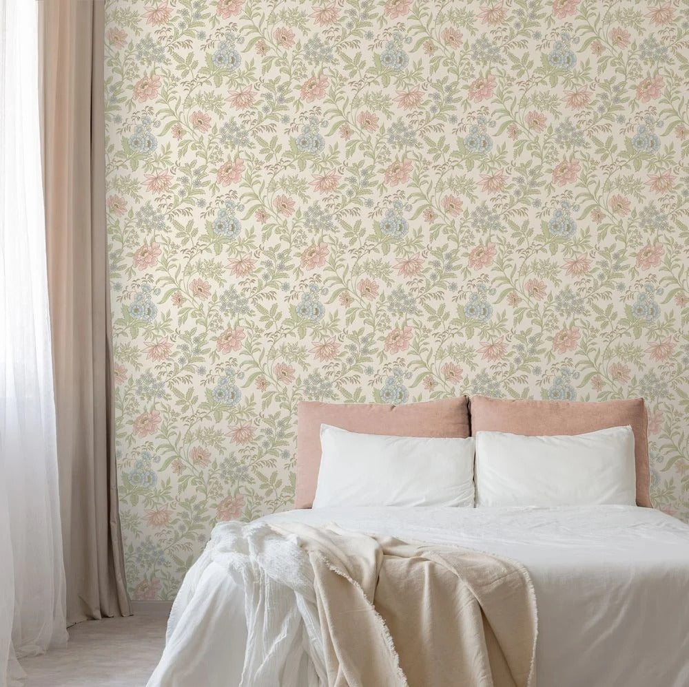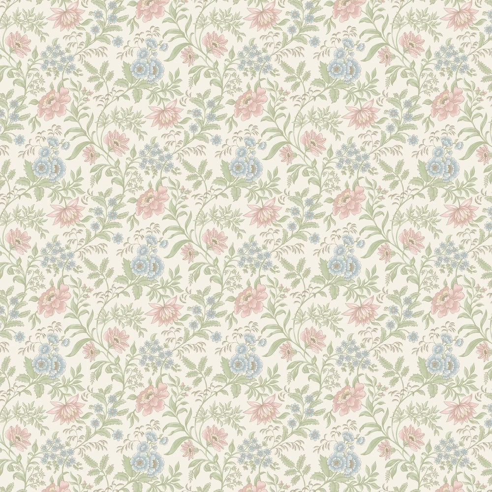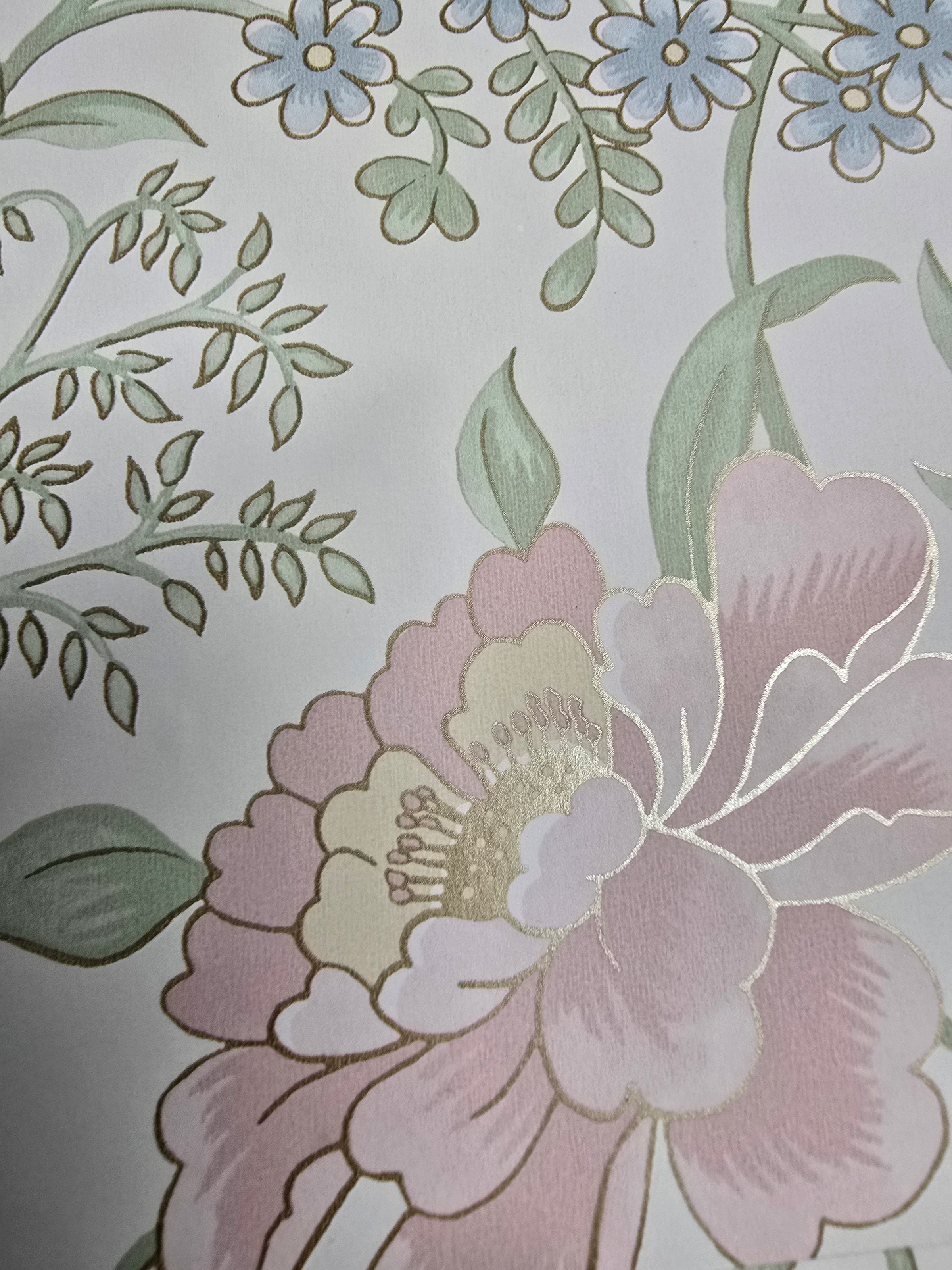 Garden Muse by Elegant Homes/Rasch is a beautifully trailing floral design, where delicate blossoms weave gracefully among fresh, vibrant garden vines. A subtle touch of gold catches the light, adding a hint of elegance to its whimsical charm. Perfect for creating a serene, nature-inspired space, this wallpaper brings the beauty of a blooming garden indoors with timeless sophistication.