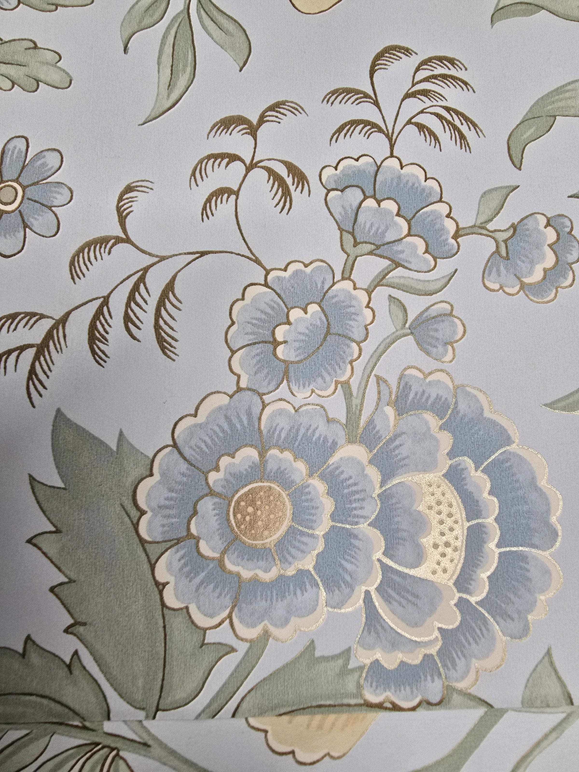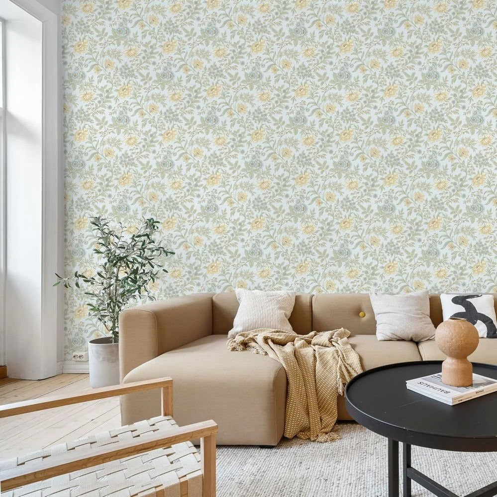 Garden Muse by Elegant Homes/Rasch is a beautifully trailing floral design, where delicate blossoms weave gracefully among fresh, vibrant garden vines. A subtle touch of gold catches the light, adding a hint of elegance to its whimsical charm. Perfect for creating a serene, nature-inspired space, this wallpaper brings the beauty of a blooming garden indoors with timeless sophistication.