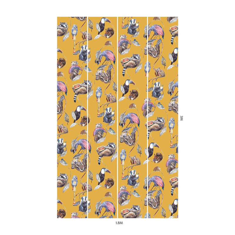 Each stroke of the artist's brush brings to life a menagerie of characters – a hookah-smoking sloth, a frog in a bowler hat, a fanning otter, and an imbibing badger, among others. Originally oil-painted onto wood, the wallpaper boasts a handcrafted finish that adds a touch of artisanal elegance to your space.