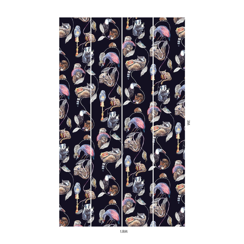 Each stroke of the artist's brush brings to life a menagerie of characters – a hookah-smoking sloth, a frog in a bowler hat, a fanning otter, and an imbibing badger, among others. Originally oil-painted onto wood, the wallpaper boasts a handcrafted finish that adds a touch of artisanal elegance to your space.