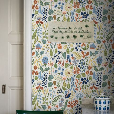 Herbarium wallpaper was designed by Stig Lindberg (one of Sweden's most loved artists) in the 1940's and 1950's - illustrating how classic this design is. 'Herbarium' ( a room where dry plants are stored) is a collection of well placed herbs and roots in stencil print technique with a cheerful undertone. Available in two colours Herbarium is a light-hearted wallcovering that adds colour and pattern to any room.