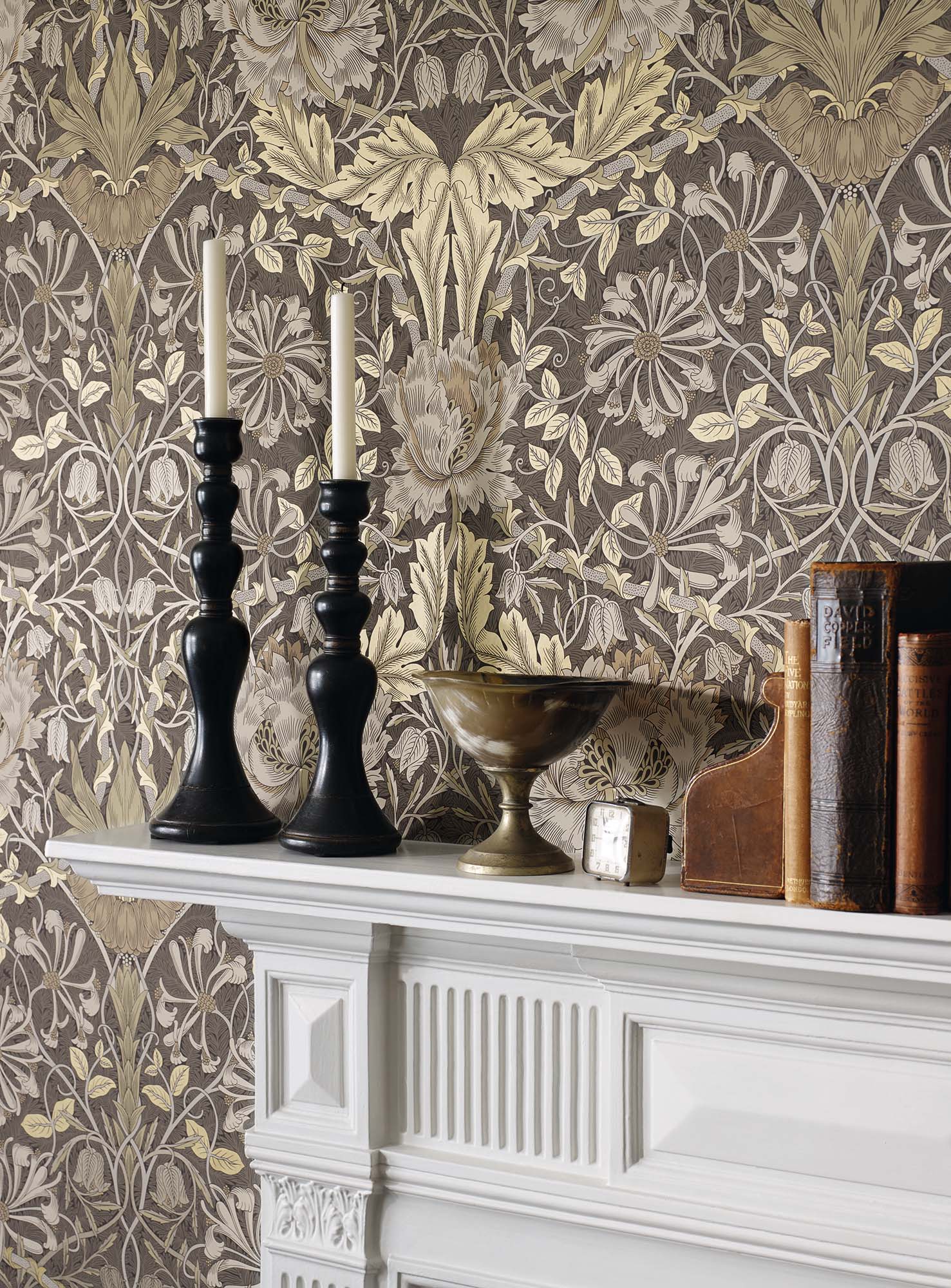 Inspired by Morris' watercolour paintings of Honeysuckle from 1876, this early Morris design creates a trellis effect with large tulips and stylised honeysuckle. Reimagined with a contemporary metallic background and vibrant colour palette. Please note: This design is wide width. Seen here in the Chocolate and Gold colourway.