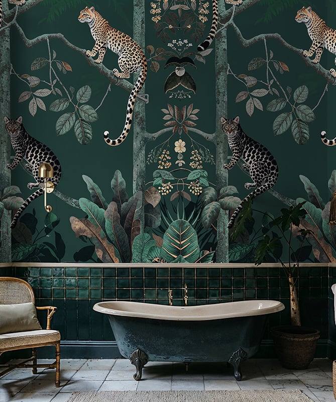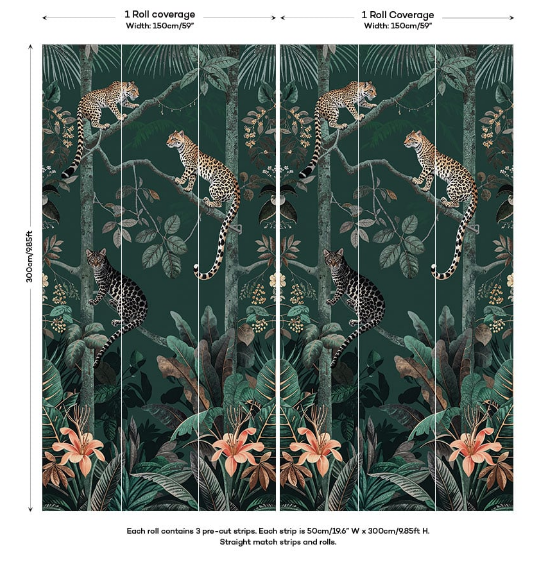 A dash of the wild for your walls - the Panthera mural is outstanding. This jungle leopard wallpaper is the epitome of an elevated tropical wallpaper. Crafted with an eye for intricate illustration detail, this high-quality wallpaper showcases majestic leopards lounging amongst rich foliage, creating a composition that radiates sophistication. This stunning wallpaper Jungle leopard wallpaper lends itself to a diverse range of interior design schemes, from the ornate and glamorous to the sleek and modern. Perfect for those who desire to add a touch of opulence to their surroundings.
