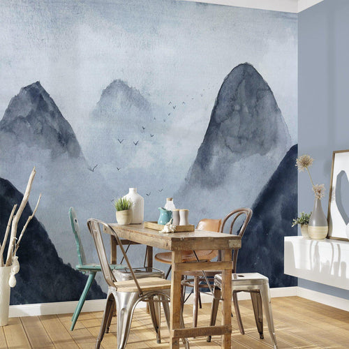 The Design: Misty Rocks mural wallpaper features a serene landscape of fog-covered rocky cliffs. Creating a calm and atmospheric vibe. Perfect for adding a touch of nature’s quiet beauty to any space. Available in Cold Blue and Desert Beige.