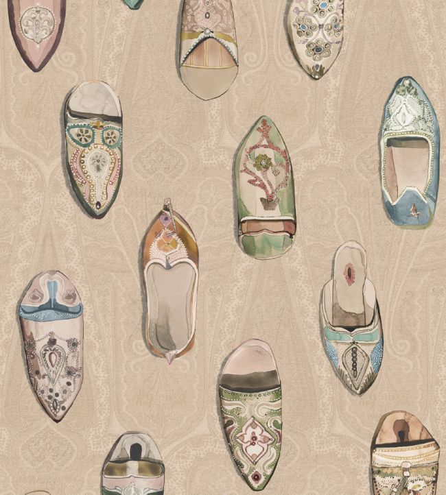 Set against a traditional paisley background, a series of ornate Moroccan slippers bring your walls to life. Please note: This is a wide width product. Seen here in the Ivory colourway.