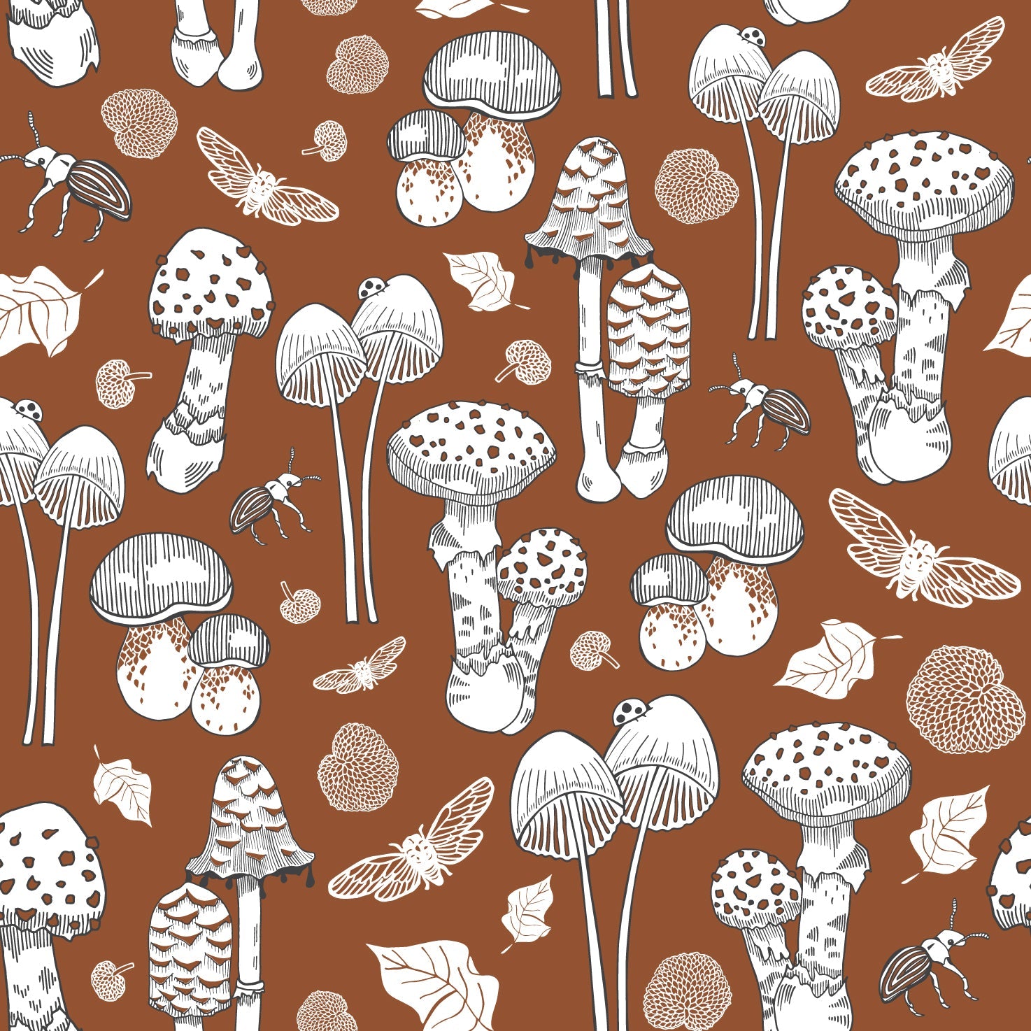 Fungi wallpaper - originally a mixed media of watercolour and wood cut designed by Nelson based Nester Prints (printmaker/illustrator) has been digitized and made it into an exclusive NZ themed wallpaper.