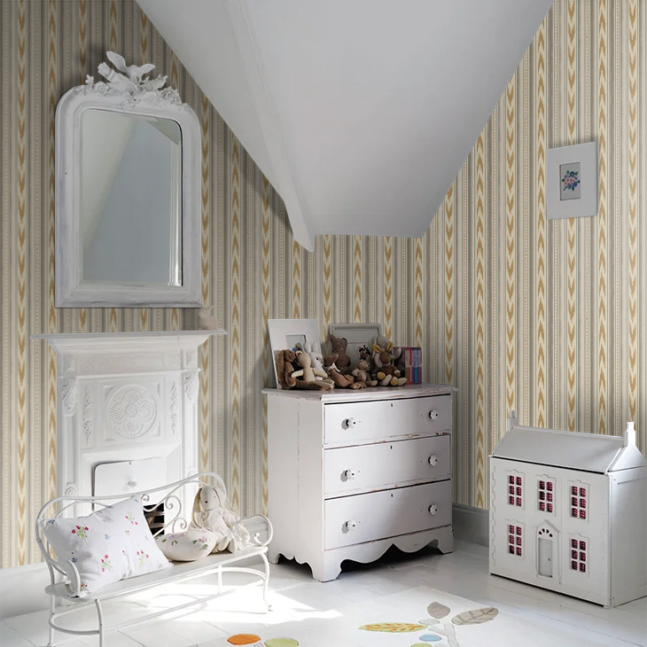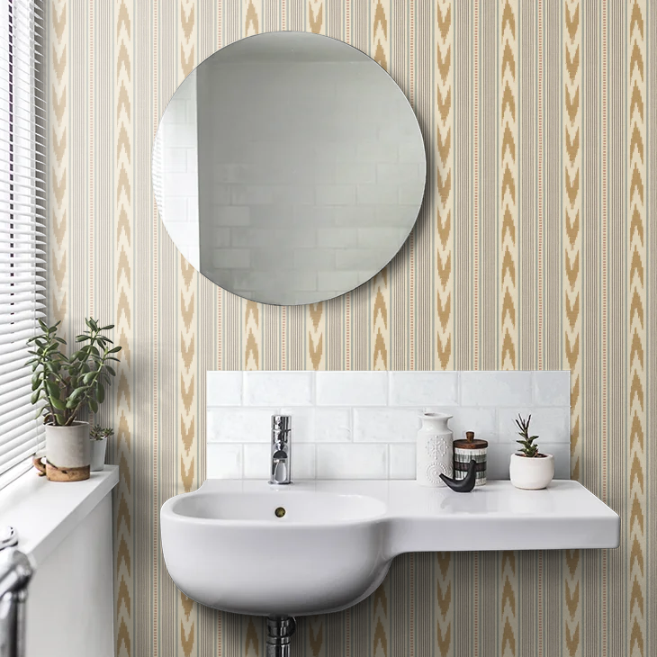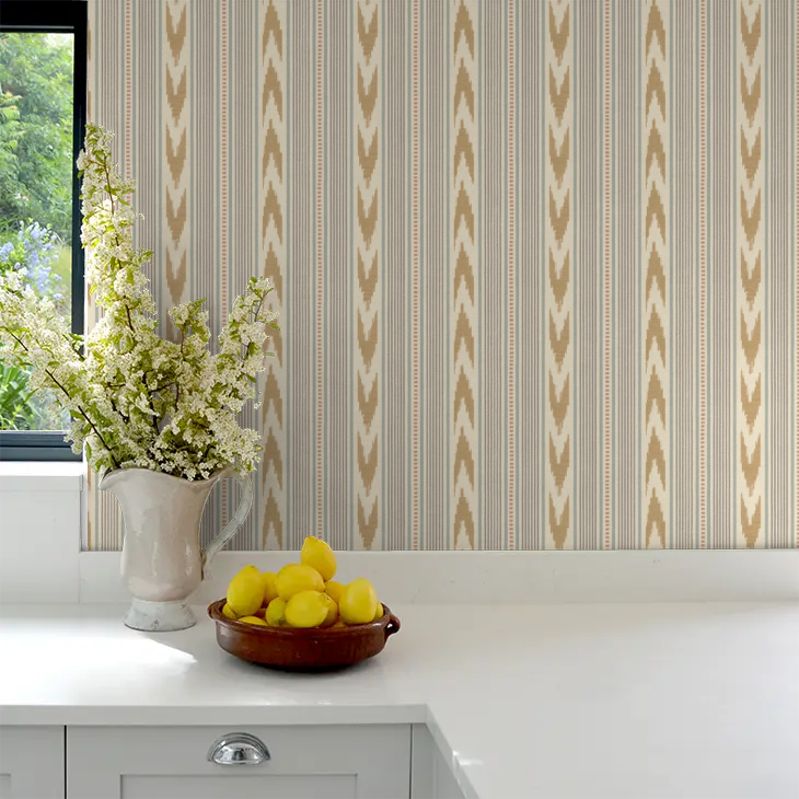 Embodying effortless style with cheerful ikat chevrons and bold ticking stripes in a faux woven effect wallcovering.
