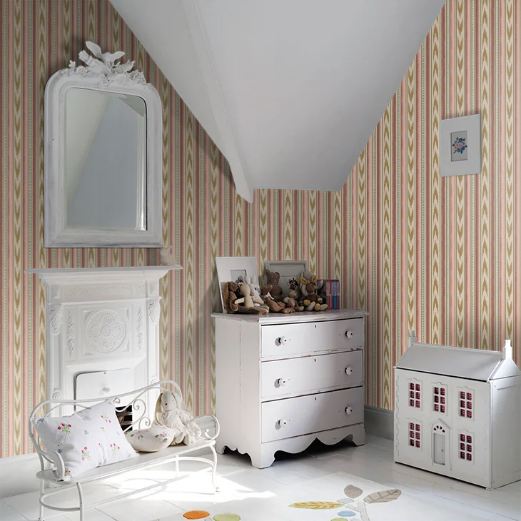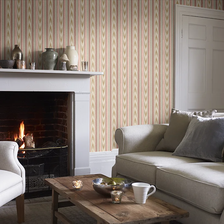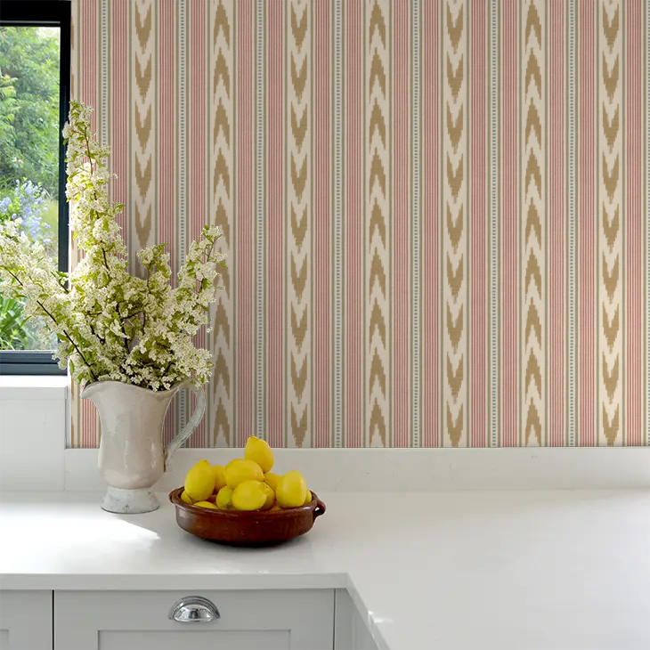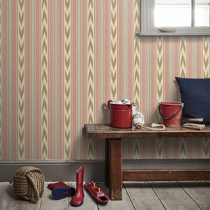 Embodying effortless style with cheerful ikat chevrons and bold ticking stripes in a faux woven effect wallcovering.
