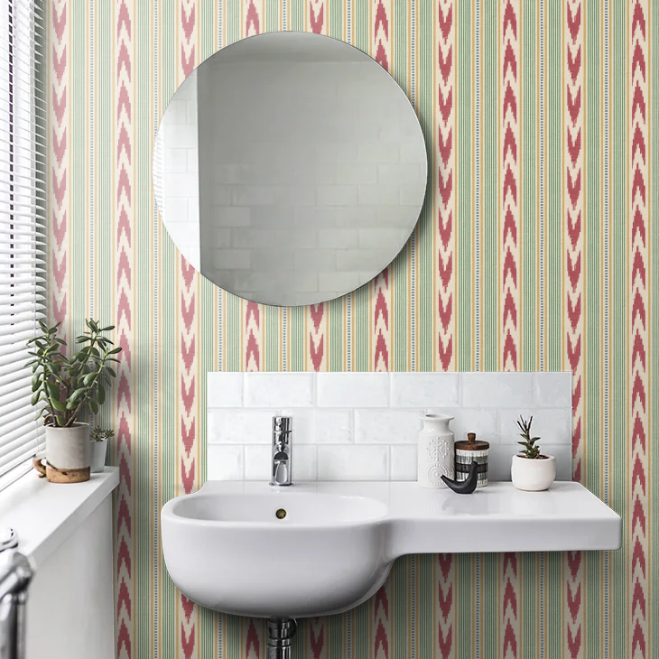 Embodying effortless style with cheerful ikat chevrons and bold ticking stripes in a faux woven effect wallcovering.
