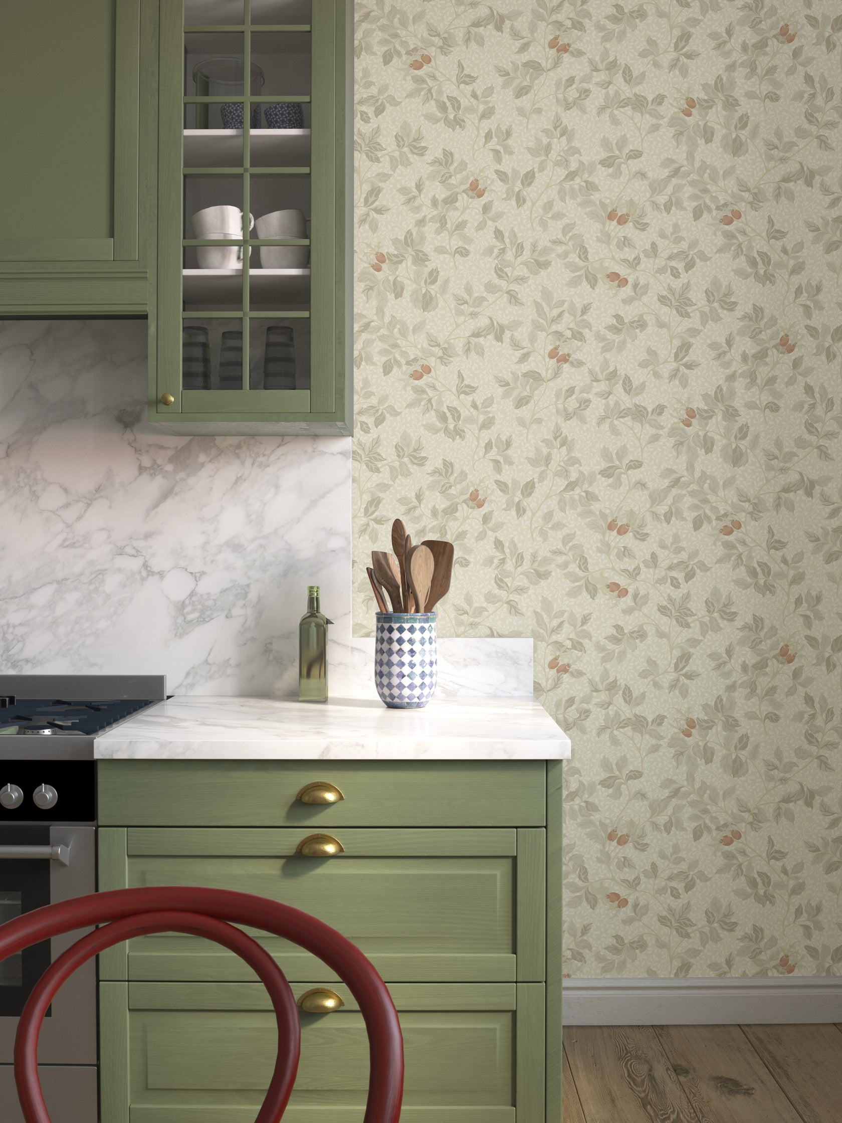 The wild rose bush serves as the inspiration, but here the flowers have faded, leaving the rose hips behind. Rose hips grow wild across our country, remaining decorative well into autumn and sometimes even through winter. Nora is both intricately winding and wild at the same time. In the background, a leafy vine grows, reminiscent of the beloved design found in Folke from our previous collection, Flora. Nora is available in four colourways, ranging from calming beige to more true-to-life shades of green and rust.