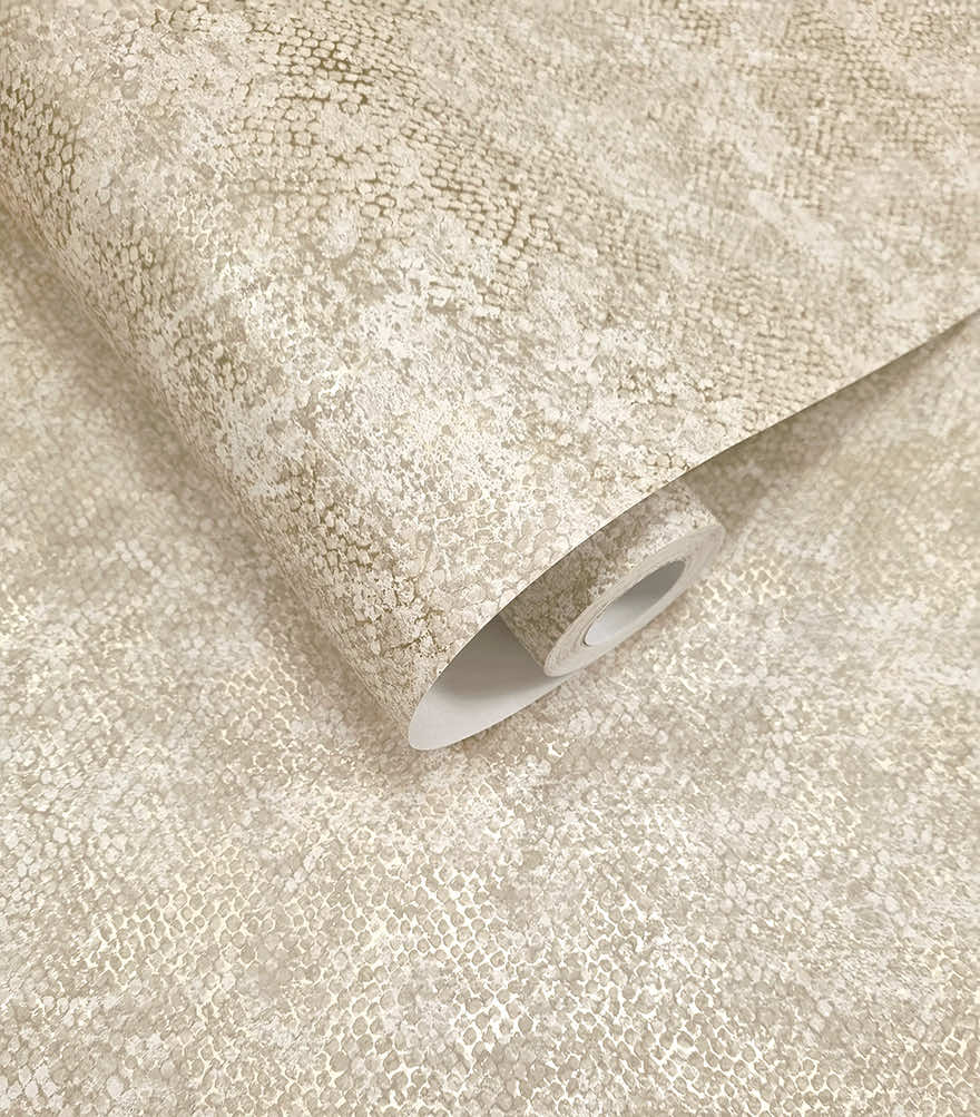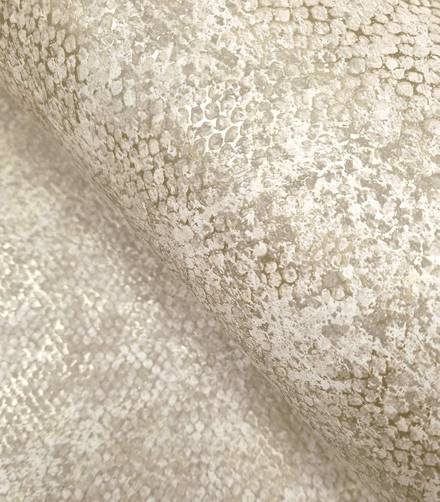 Inspired by snake skin and adorned with a scale-like metallic pattern and a raised surface. This luxurious design enhances any space. PVC-Free textured wallcovering.
