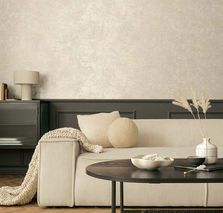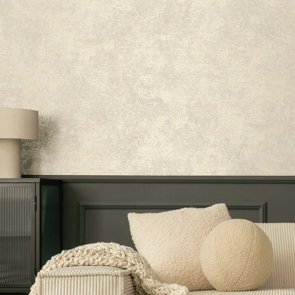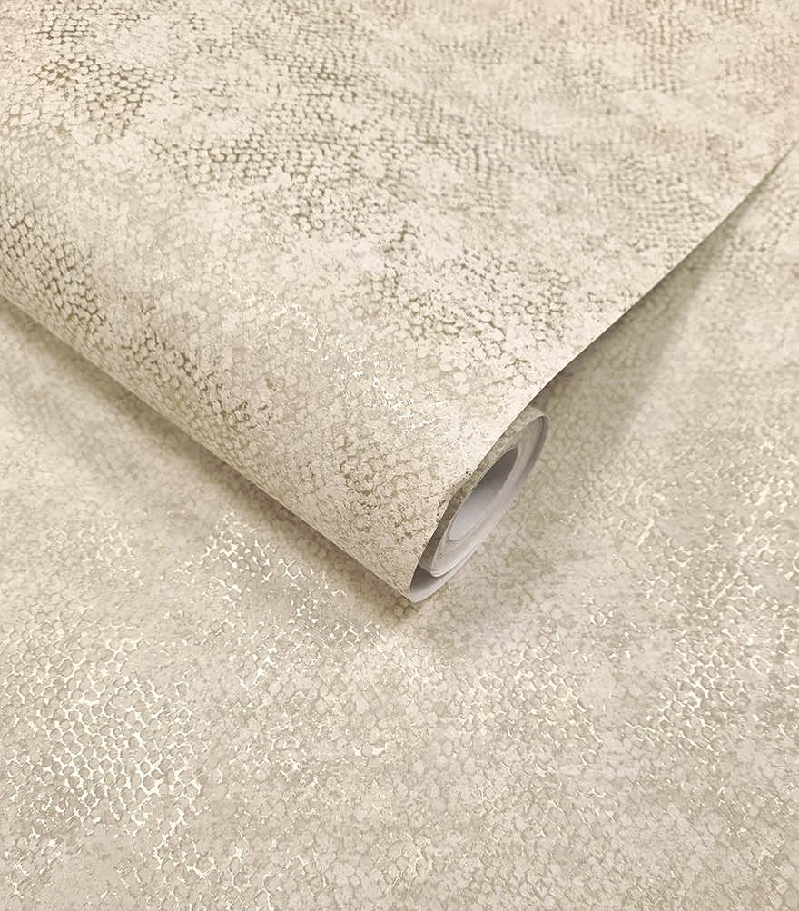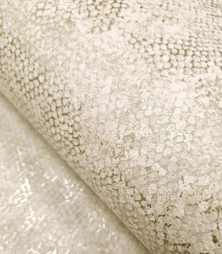 Inspired by snake skin and adorned with a scale-like metallic pattern and a raised surface. This luxurious design enhances any space. PVC-Free textured wallcovering.