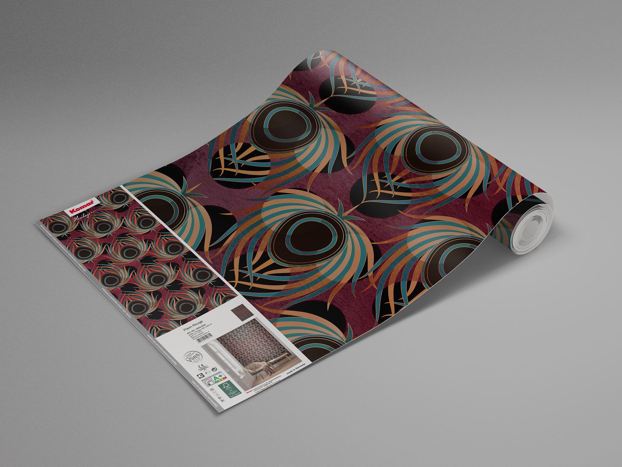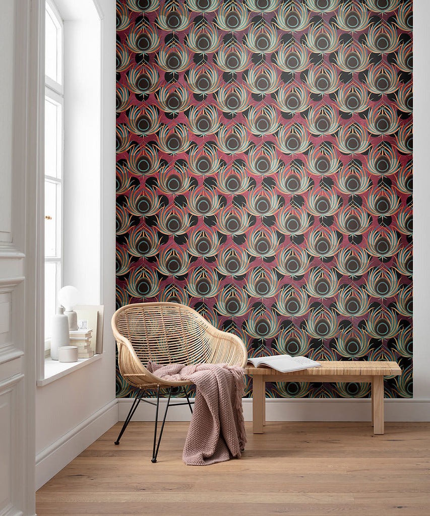 The Design: Make a bold statement with the Opulent Plume Wall Mural, a dazzling tribute to timeless Art Deco elegance infused with the beauty of nature. Featuring a mesmerizing pattern of peacock feather-inspired motifs in rich hues of burgundy, teal, and gold, this mural creates an atmosphere of opulence and sophistication. The intricate, layered design gives a sense of texture and depth, drawing the eye and sparking conversation.