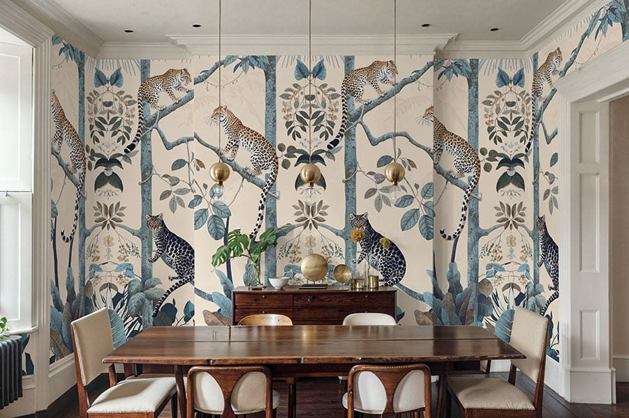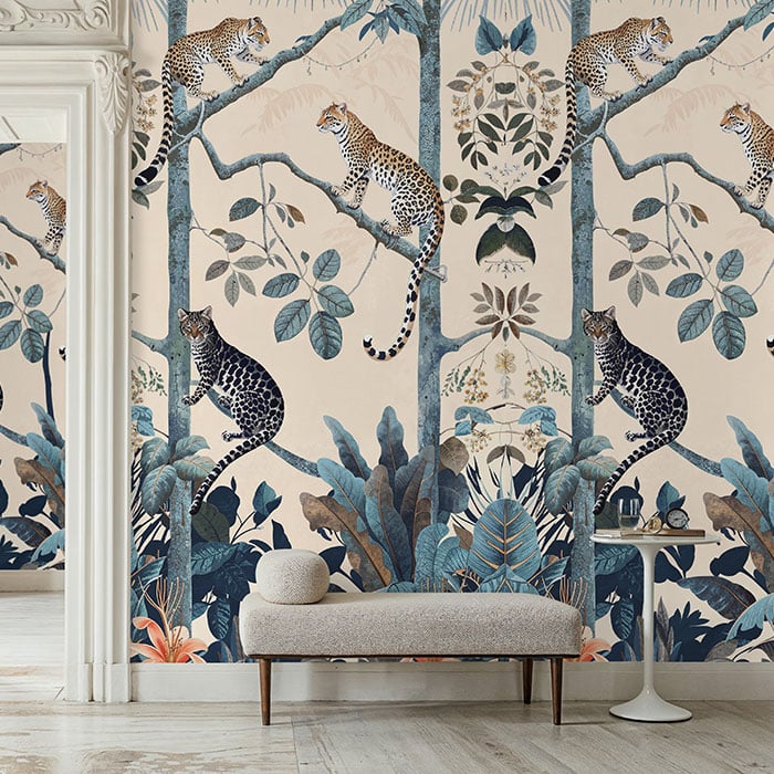 A dash of the wild for your walls - the Panthera mural is outstanding. This jungle leopard wallpaper is the epitome of an elevated tropical wallpaper. Crafted with an eye for intricate illustration detail, this high-quality wallpaper showcases majestic leopards lounging amongst rich foliage, creating a composition that radiates sophistication. This stunning wallpaper Jungle leopard wallpaper lends itself to a diverse range of interior design schemes, from the ornate and glamorous to the sleek and modern. Perfect for those who desire to add a touch of opulence to their surroundings.