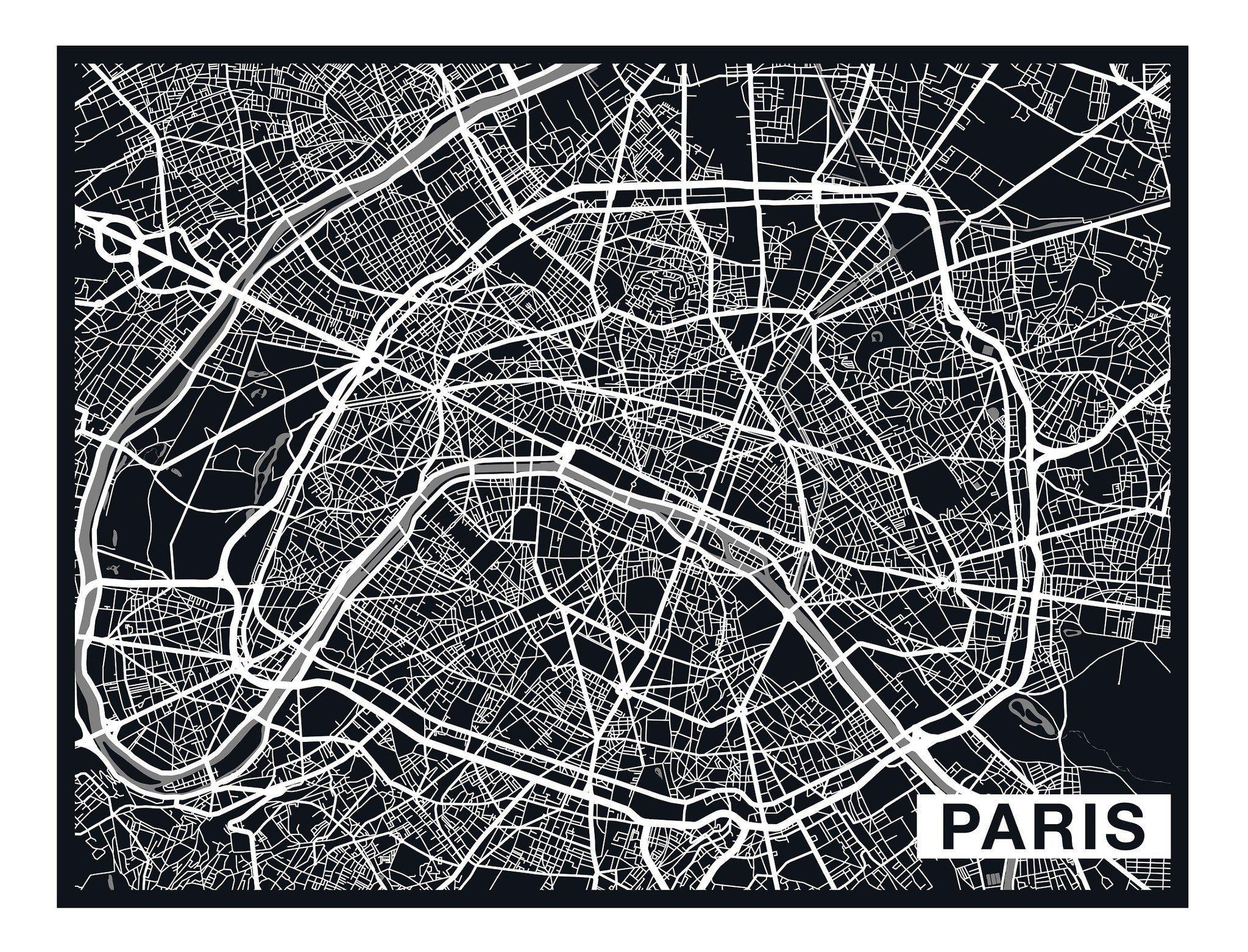 Paris City Art Map - Ebony - Custom Sized Wallpaper Mural (per m2)