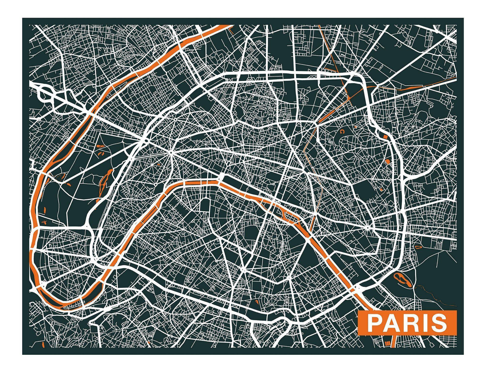 Paris City Art Map - Orange - Custom Sized Wallpaper Mural (per m2)