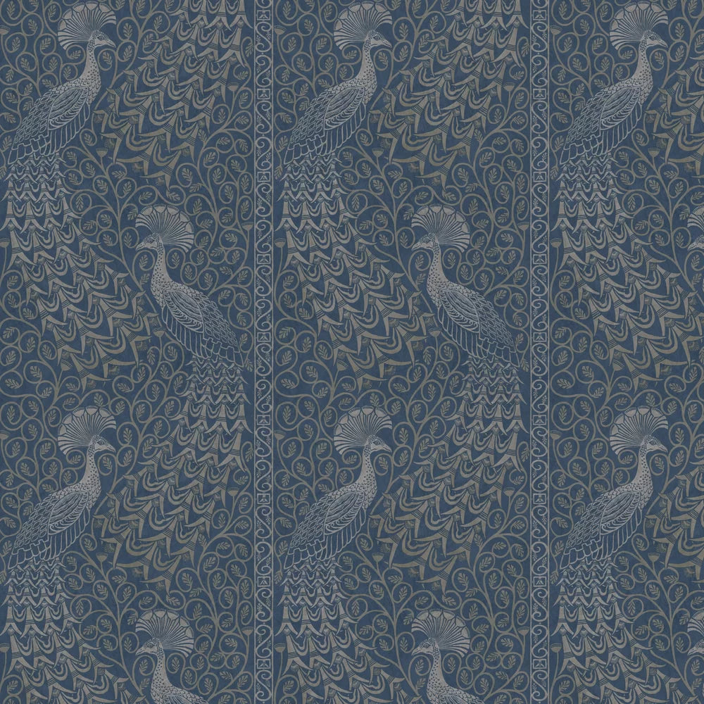 Pavo Parade Peacock Wallpaper - Metallic Silver/Denim
