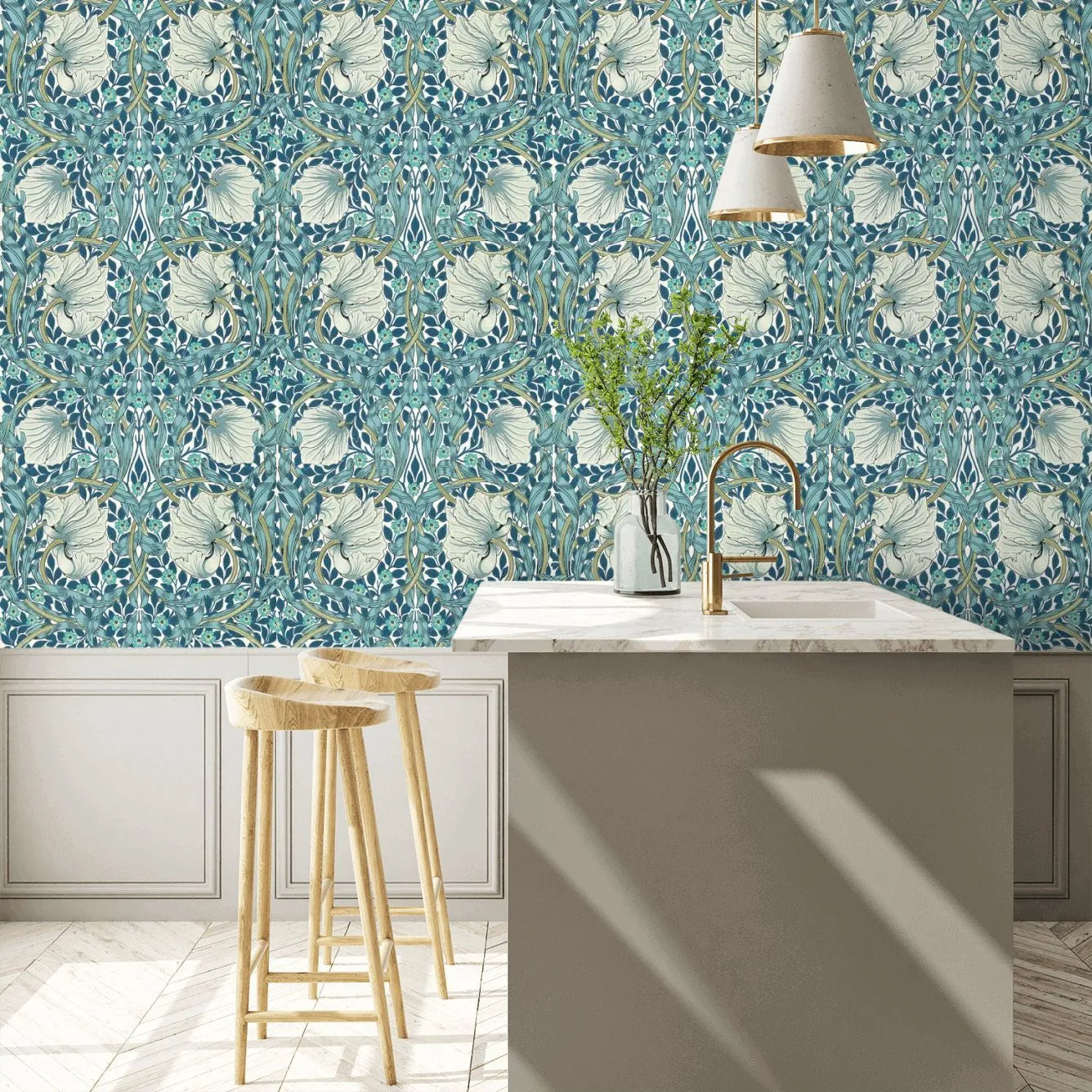 A stunningly beautiful classic Morris style floral trellis with circular shapes and a strong symmetrical pattern within the leaves. Shown in soft shades of green with blue and yellow details – available in other colours. An exclusive colourway, created exclusively on a non-woven paper.
