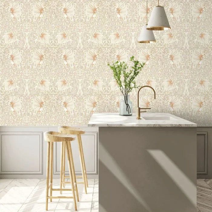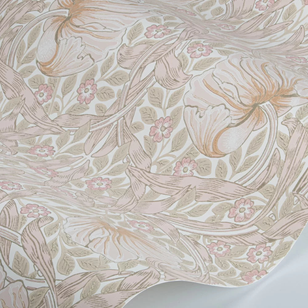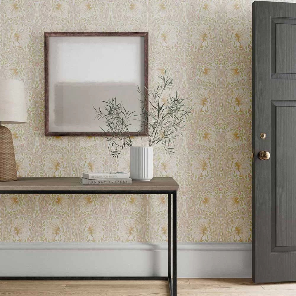 A stunningly beautiful classic Morris style floral trellis with circular shapes and a strong symmetrical pattern within the leaves. Shown in soft shades of green with blue and yellow details – available in other colours. An exclusive colourway, created exclusively on a non-woven paper.