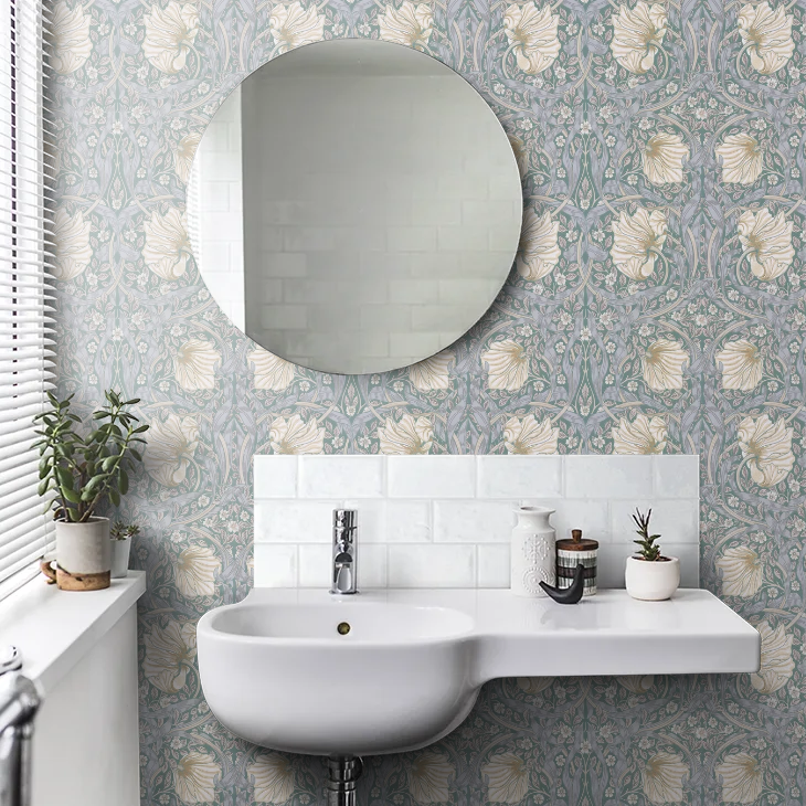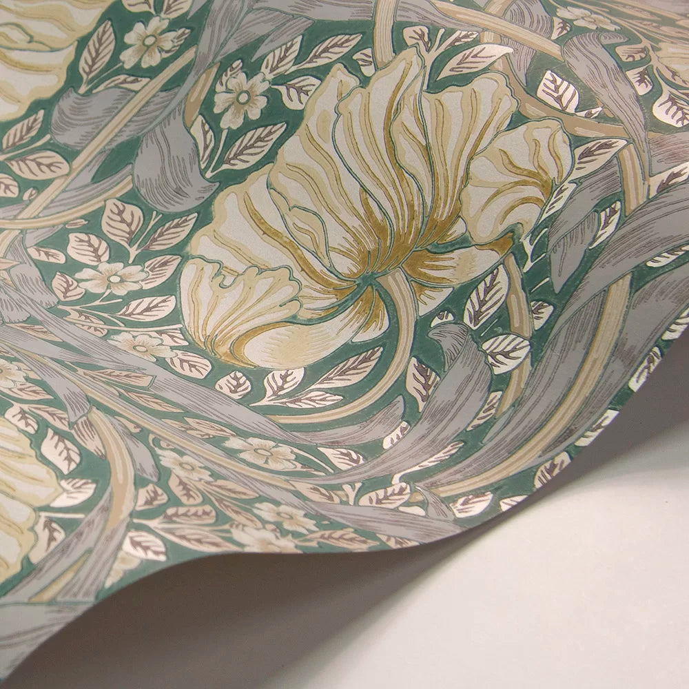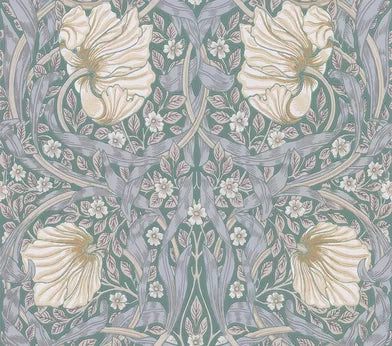 A stunningly beautiful classic Morris style floral trellis with circular shapes and a strong symmetrical pattern within the leaves. Shown in soft shades of green with blue and yellow details – available in other colours. An exclusive colourway, created exclusively on a non-woven paper.