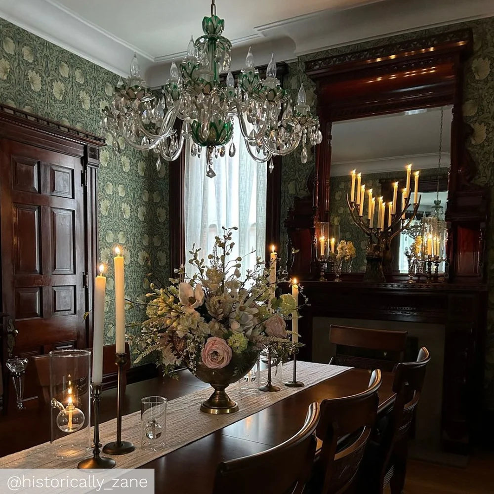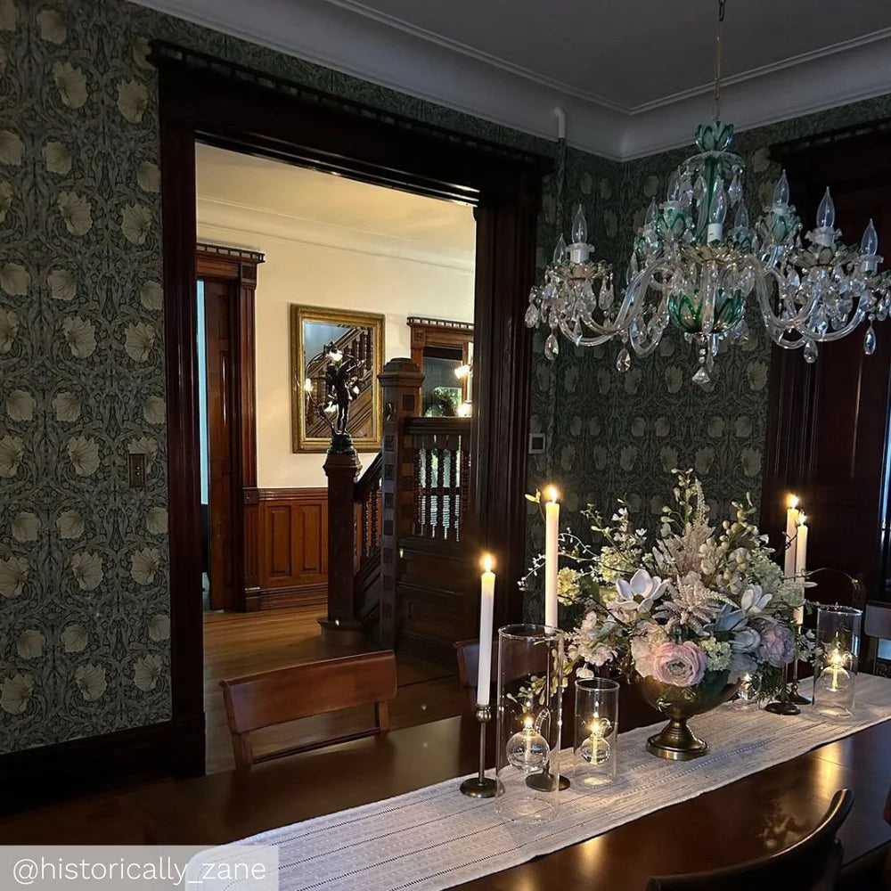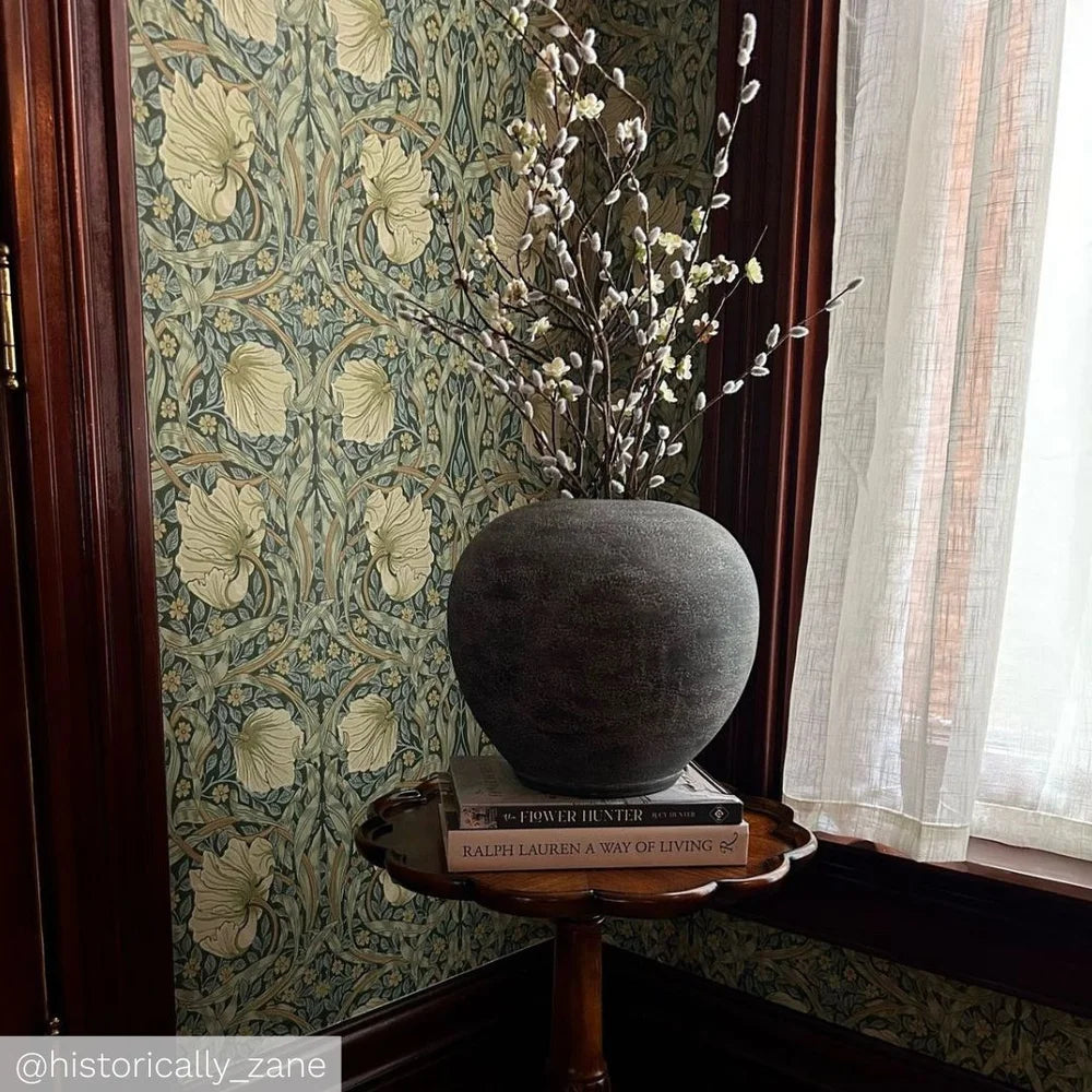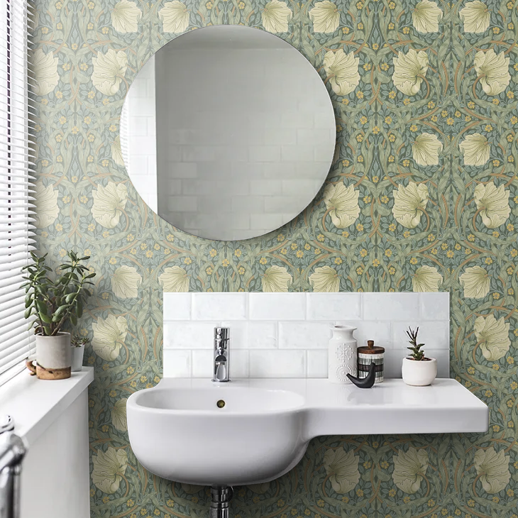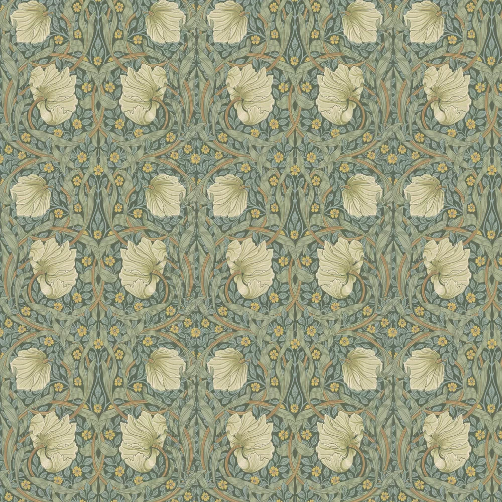 A stunningly beautiful classic Morris style floral trellis with circular shapes and a strong symmetrical pattern within the leaves. Shown in soft shades of green with blue and yellow details – available in other colours. An exclusive colourway, created exclusively on a non-woven paper.